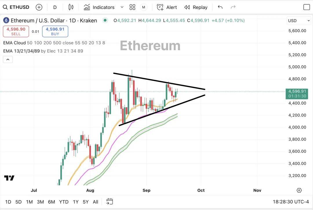 分析师表示,这种结构叫“看涨三角旗”,常常出现在价格爆发前的整理阶段。而 ETH 的移动均线还在向上,说明短期趋势依然强劲。