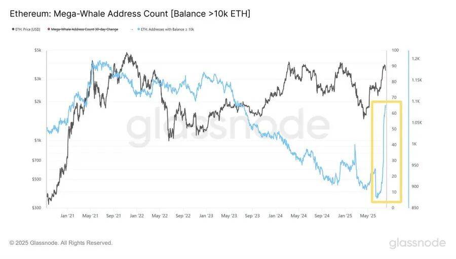 大鲸鱼也在默默加仓链上数据显示,持有超过 10,000 枚 ETH 的地址,最近几个月明显增加。 什么意思?就是那些超级大户(可能是机构,也可能是早期玩家)开始重新看多 ETH,而且是用真金白银在支持。 研究员戴安娜·桑切斯指出,这些地址在很长一段时间内都比较安静,现在突然活跃,很可能是提前预判了 ETH 会进一步走强。 更猛的是,持有 10,000 到 100,000 枚 ETH 的钱包,账面浮盈已经接近 2021 年牛市顶峰时的水平。 交易所库存创新低,抛压越来越小根据 CryptoQuant 的数据,目前交易所里剩下的 ETH 只有 1690 万枚,这是好几年来的最低水平。 这代表什么?很可能是: