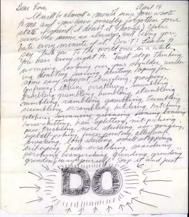 ![]() Letters Live was launched in 2013 by Caningate in the UK with the aim of paying tribute to the art and spirit of letter writing. Each episode of this television show invites well-known actors to come up to the microphone and read letters aloud. These dusty letters are like tiny fragments of history that take people back in time, allowing them to experience those moments once again. Today, we choose an excerpt from a letter written by the American pioneer artist Saul LeWitt to his close friend Eva Hesse, read aloud for us by Cumberbatch. In 1965, Hesse's artistic creativity reached a bottleneck, leaving him in a state of confusion and despair, accompanied by deep self-doubt. She confided her inner struggles to Levitt. A few weeks later, Leavitt replied to her with a wonderfully crafted letter. The letter spanned five pages, and the prominent “DO” clearly represented Sol’s encouragement for Eva to go ahead and “do it”. Read by Benedict Cumberbatch ▼ The narrated version by Andrew Scott ▼ Fragment Learn to say “fuck you”to the world every once in a while. You have every right to. Just stop thinking, worrying, looking over your shoulder, wandering, doubting, fearing, hurting, hoping for some easy way out, struggling, grasping, confusing, itching, scratching, mumbling, bumbling, grumbling, humbling, stumbling, numbing, rambling, gambling, tumbling, stumbling, scrambling, hitching, hatching, bitching, moaning, groaning, honing, boning, horse-shitting, hair-spitting, nit-picking, piss-trickling, nose-sticking, ass-gouging, eyeball-poking, finger-pointing, alleyway-sneaking, long waiting, small stepping, evil-eyeing, back-scratching, searching, perching, besmirching, grinding, grinding, grinding away at yourself. Stop it and just DO! ![]() Sender | artist: Sol LeWitt ![]() Recipient | artist: Eva Hesse This letter was written on April 14, 1965; at that time, Sol LeWitt was 37 years old and Eva Hesse was 29 years old. The letter is on ink-on-paper and consists of five single-sided pages. It is housed in the Levitt Collection in Chester, Connecticut, United States. Translation Dear Eva,: It’s been almost a month since you wrote to me, and you might have forgotten how you felt at that time (although I don’t think so). You look just like you always have—hating every single minute of your life. Don’t do that! You need to learn to tell the world “fuck off” from time to time. You certainly have every right to say that. Stop thinking about it, worrying about it, being careful, wondering, doubting, fearing, feeling sad, trying to find shortcuts, struggling, craving, getting confused, feeling itchy, scratching, muttering, grumbling, complaining, speaking in a low voice, stumbling, murmuring, wandering around, taking chances, falling, downplaying things, fighting over them, staggering, plotting, mocking, groaning, lamenting, longing, last-minute efforts, talking nonsense, engaging in pointless arguments, being overly critical, wasting time, meddling in others’ affairs, scratching one’s own back, poking others in the eyes, blaming each other, taking shortcuts, waiting for a long time, walking slowly, looking at people with hostility, exploiting each other, searching, stopping, contaminating things, and torturing yourself. Stop right now Go do it! Based on what you’ve described and what I know about your previous creative abilities, what you’re doing sounds really great. “Drawing, erasing, being awake and yet mad like a machine, bigger, bolder… all meaningless. It sounds so good, so wonderful—“all meaningless.” Creating more of this kind of stuff—only more meaningless, more insane, more machine-like, more beastly, whatever—it’s all about surrounding it with nothingness. Try to stir up those things inside you, your “quirky temper”. You belong to that most secret part of yourself, deep within your heart. Don’t worry about staying calm; just let yourself lose your composure. Create your own world, one that is entirely yours. If you are afraid, let fear work for you—visualize your fears and worries. Stop worrying about big, profound questions like “how to choose a meaning for one’s life and a way of living, how to pick a firm path that might lead to an impossible destination, or even a destination that is merely imagined”. You must practice becoming stupid, slow, reckless, and empty. And then you will have the ability to do it! I have a lot of confidence in you; even if you are torturing yourself right now, what you are doing is really good. Try to create something “bad” – the worst thing you can possibly imagine – and see what happens. But most of all, relax and let it all go. You don’t have to be responsible for the world; you only need to be responsible for your own creation. So, Go do it! And don’t think that your creation has to follow any preconceived form, idea, or characteristic; it can be whatever you want it to be. But if stopping what you’re creating would make life easier for you, then stop—don’t punish yourself. However, I think it has already taken deep root in your mind. So, an easier way to do it is…: Go do it! Speaking of which, I quite understand how you’re feeling because I sometimes go through similar experiences myself. I subject my own work to a “painful reevaluation,” trying my best to overturn everything I’ve done before—disliking whatever I’ve produced and striving to create something completely different and better. Perhaps that process was necessary for me, it motivated me to keep moving forward and made me feel that I could create something better than what I had just done. Perhaps you need to struggle a bit to complete the work, or perhaps it will push you to do better, but I understand that it can be very painful. If you have the confidence to just go for it and let go of all those thoughts, it will be easier. Can’t you put aside words like “world” and “art” and stop i