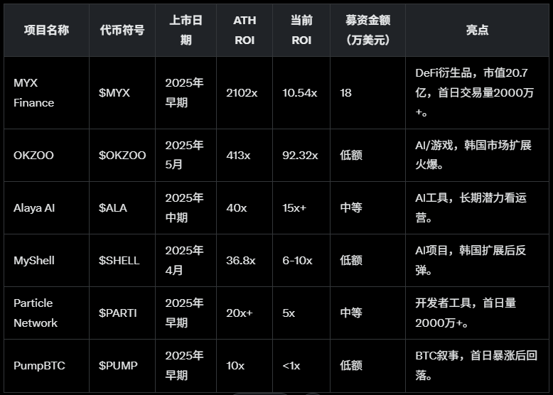 三、Binance Launchpad:蓝筹项目的“稳健”推手 相比Wallet IDO的“高风险高回报”,Binance Launchpad(IEO平台)以合规和稳定性著称。需KYC和30天BNB质押快照,适合大户和机构。截至2025年,Launchpad举办38个项目,平均募资380万美元,94%项目ROI为正,历史明星如Axie Infinity (AXS, 100x ATH)至今为人津津乐道。 2025年表现 今年,Launchpad聚焦基础设施和再质押协议,如AEVO和ether.fi,平均ATH ROI约10x,当前ROI稳定在5-10x。相比Wallet IDO的爆炸性回报,Launchpad更“稳健”,但总市值更高(超1000亿美元)。“Launchpad是长期投资者的首选,回报虽不如IDO夸张,但胜在安全。” 对比表格:Wallet IDO vs. Launchpad(数据截至2025年9月18日) ![]()