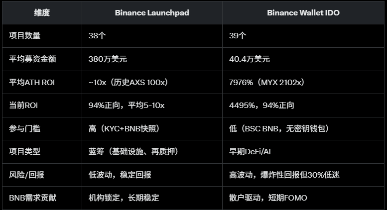 截至 2025 年 9 月 18 日,Binance 已完成 32 次季度销毁,累计销毁约 54-55 百万枚 BNB,总价值超过 550 亿美元(基于当前 BNB 价格约 1004 美元/枚计算),目前供应量接近 1.45 亿枚,趋向目标 1 亿枚。历史数据显示,销毁后BNB常迎来20%-50%涨幅,堪称“价格催化剂”。 3.市场信心与外部利好2025年,加密友好政策预期升温,Binance合规进展获机构认可。X用户感叹:“BNB从200美元涨到1000美元,长期持币者已财富自由!” 企业财资锁定1.6亿美元BNB,进一步减少流通量。 在这场狂欢中,Binance Wallet IDO和Launchpad通过项目孵化与BNB质押机制,贡献了价格上涨的40%以上。下面,我们深入对比两大平台的表现! 二、Binance Wallet IDO:散户的“暴富”发动机 Binance Wallet作为去中心化钱包的DeFi入口,已成为2025年IDO(Initial DEX Offering)市场的超级明星。截至9月18日,平台举办39个IDO项目,平均募资40.4万美元,总市值达41.9亿美元,24小时增幅47.2%。 其核心机制是BNB质押参与,门槛低(仅需BSC链上BNB),分配按比例计算,堪称散户友好。 惊人回报:平均ROI神话 CryptoRank数据显示,Binance Wallet IDO平均ATH(历史最高)ROI高达7976%,当前ROI 4495%,94%项目保持正收益,远超BSCPad等平台的负回报。 BNB Chain项目占顶级ROI的70%,如MYX Finance的2102x回报,点燃市场热情。有人惊呼:“Binance Wallet IDO回报吊打全场,散户的财富机器!” 明星项目细节一览 以下是2025年部分顶级IDO项目表现(数据来源CryptoRank、Dune Analytics): ![]()