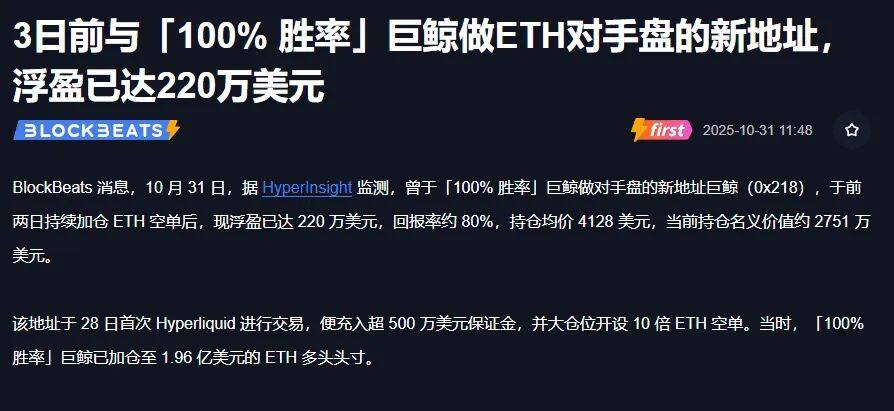 An exciting showdown in the currency circle! ![]() According to BlockBeats, HyperInsight detected a mysterious new address (0x218) on October 31. Three days ago, it dared to compete with the ETH whale, which claimed to have a "100% winning rate". Now it has made a direct profit of US$2.2 million, with a return rate of over 80%. This operation is simply unbelievable! Things started on the 28th. This new address was traded on Hyperliquid for the first time. As soon as it was sold, more than 5 million U.S. dollars was charged as a deposit, and a 10 times short ETH order was opened for a large position. Coincidentally, at that time, the "100% winning rate" whale had just increased its long position in ETH to US$196 million. The two sides directly leveraged each other, and staged a famous scene of long-short duel! In the next two days, the new address continued to place short ETH positions, with an average position price of $4,128. The current nominal value of the position is approximately $27.51 million. On one side are the old "win rate kings" betting on the long side, and on the other side are the new forces betting on the short side. The market game is so exciting! The currency circle has always been full of myths about getting rich and fierce confrontations. How will this long-short war develop in the future? Will the new address continue good luck, or will the whale defend its "invincible golden body"? No matter what, this wave of operations made the onlookers' hearts beat faster. The madness and opportunities in the currency circle are always unpredictable. That’s it for this article. If you want to seize the current crypto market, it’s definitely too late to learn and sell now. It’s best if someone can help you get started quickly. Scan the QR code below to join the group and learn to follow orders! ! ! ![]() |