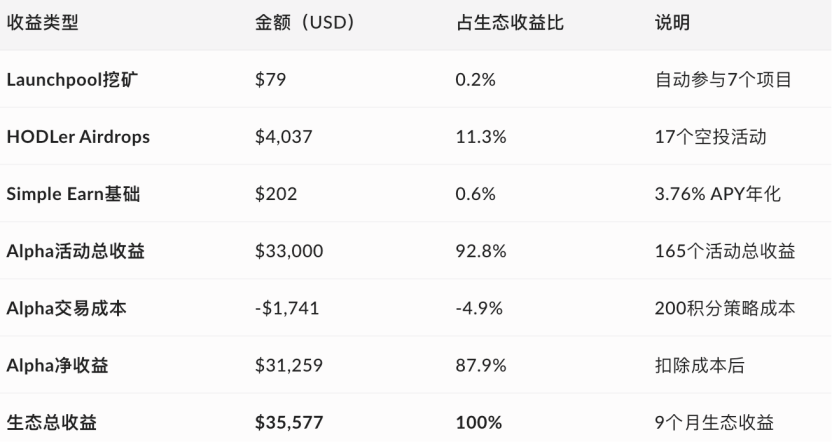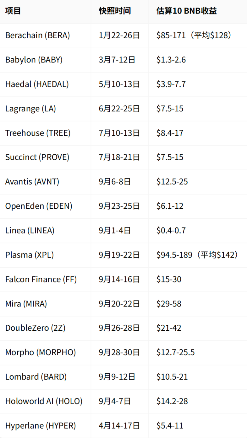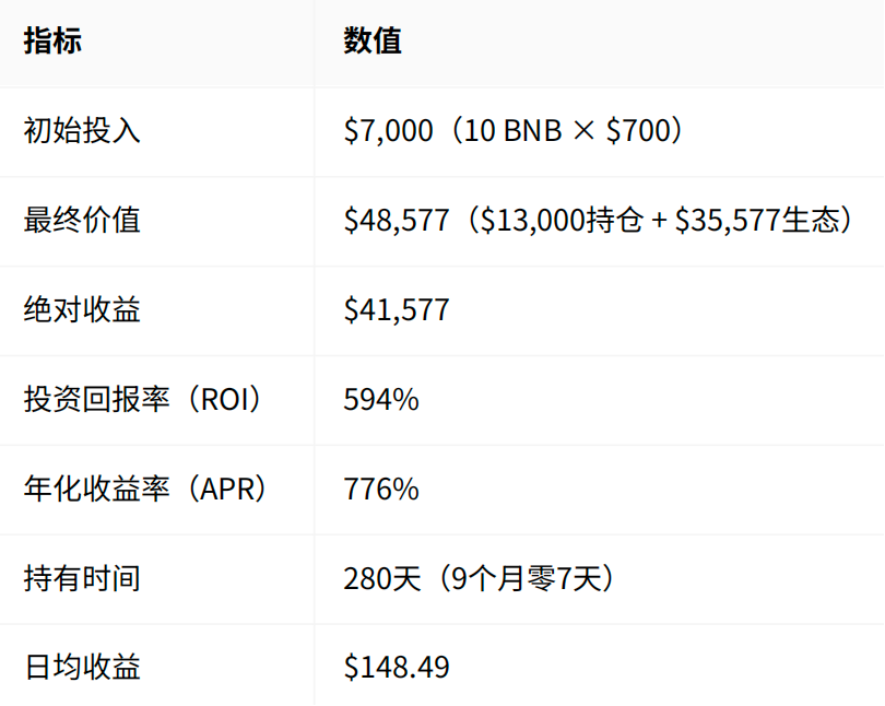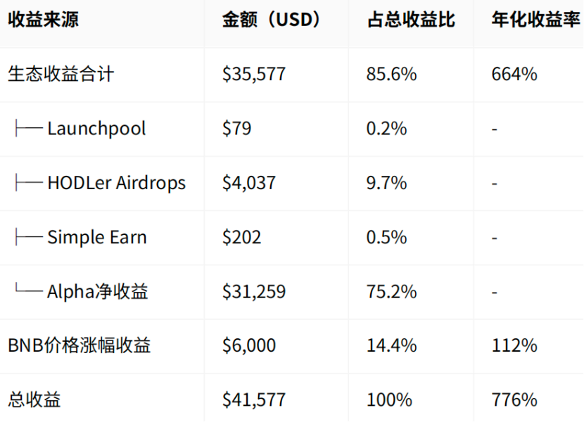 During the National Day, Big Pie reached a new high and BNB reached a new high five times. Apple life is no longer good, BN life is the top enjoyment. The most handsome guy in this bull market, BNB is said to be first, no one dares to say second. The boys in the cottage were silent and guard E shed tears. Nowadays, 3BNB, which is needed for new games, is becoming more and more out of reach for everyone. Everyone calls Uh-huh, now everyone wants to be Uh-huh. ![]() So let’s see, if we took 10 BNB from the beginning of the year and didn’t engage in derivatives or fight local dogs, how much profit would we have now? We know that in addition to price increases, the BNB ecosystem mainly includes Launchpool mining, HODLer Airdrops, Simple Earn, and Alpha activities. Explained one by one below ![]() Launchpool mining revenue 10 BNB’s income details from participating in 7 projects: ![]() Launchpool total revenue: approximately $79 USD ![]() HODLer Airdrops Benefits Based on the estimated Simple Earn pool (5-10M BNB), the income of 10 BNB in 17 airdrops: we take the median calculation ![]() HODLer Airdrops total revenue is approximately $4,037 USD ![]() Simple Earn basic income Calculation parameters: Basic APY: 3.76% (weighted average from January to October 2025) BNB average price: $700 (comprehensive monthly average price) Position value: 10 BNB × $700 = $7,000 Holding time: 280 days Therefore, we can get: Annualized return = $7,000 × 3.76% = $263.20 Actual return = $263.20 × (280/365) = $202 USD ![]() BNB Alpha activity income Everyone who trades Alpha knows: Currently, it is a points system, which means that balance + trading volume must be met at the same time. Here, active trading is used for calculation. From April to October, there were a total of approximately 165 airdrop/TGE activities. The income from monthly activities fluctuates. In the early stage, there may be more than 200 dollars each time, but in July and August, there are many small profits. There were many big gains again in September. Typical high value activities include the following: ![]() Total proceeds from participating in all 165 events: $33,000 In terms of transaction costs, since most activities currently require a points threshold of 200-250 ![]() If we use the 200-point scenario, the transaction cost is $1,741 From the above, it can be concluded that Alpha’s net income reached an astonishing $31,259 ![]() The total income from the above 4 ecological benefits is: $35,577 ![]() If the profit from BNB price change is $700 per coin on January 1st and $1,300 per coin today, then the profit from the price change is $6,000. ![]() We can summarize all the above benefits Summary statement of comprehensive income ![]() The direct rate of return of BNB can be expressed more intuitively: BNB investment return analysis table ![]() Conclusion It’s not that I don’t know, it’s just that I was shocked. I also gradually understand why BSC has many believers. The BSC ecosystem can not only provide long-term holders with an annualized return of 154%, but also provide active participants with an annualized excess return of 776%. What’s more worth mentioning is that the senior management of the BSC chain is still listening to the public’s voices on the front line and actively interacting with the community. ![]() I believe BNB will get better and better. ![]() |
