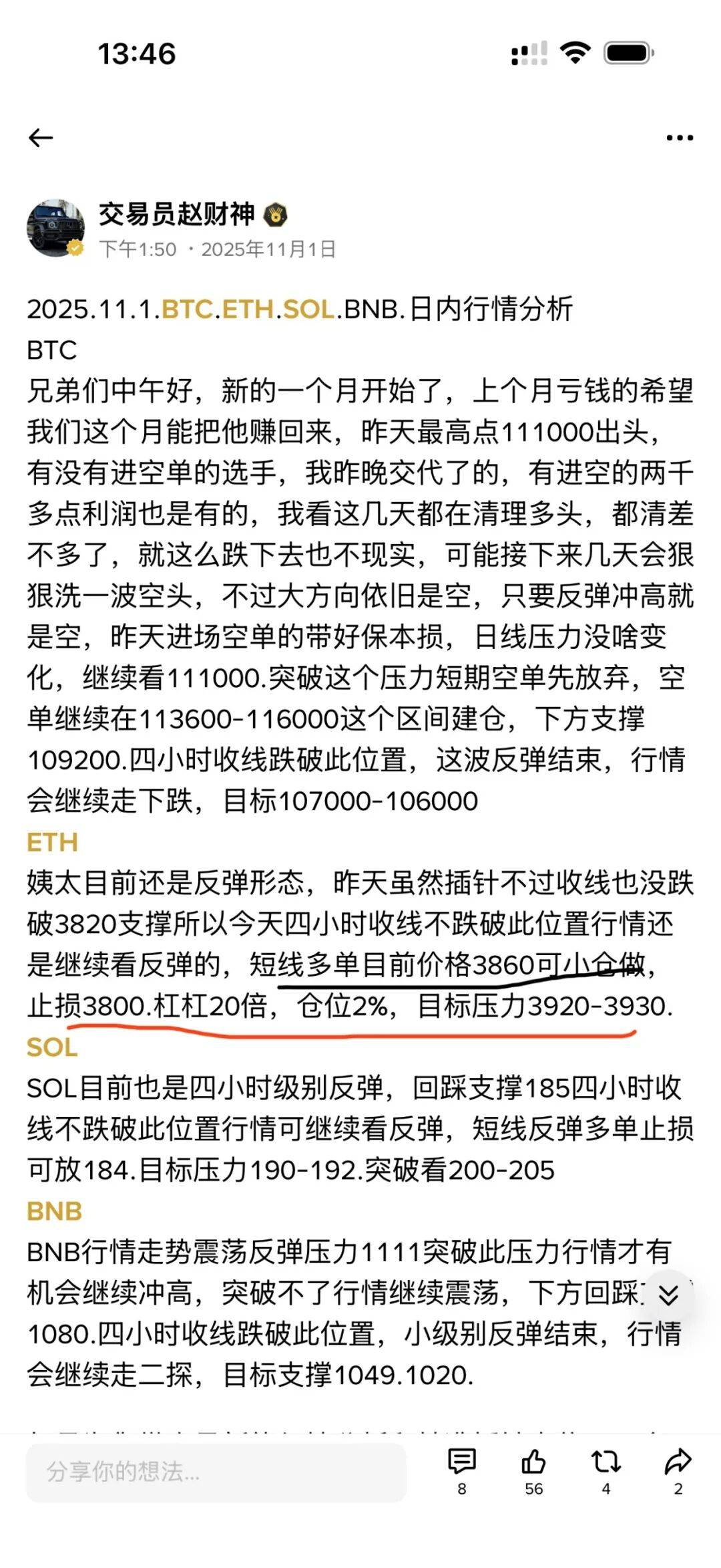 2025.11.2.BTC.ETH.SOL.BNB.Intraday market analysis BTC Good afternoon, brothers. The market is like this over the weekend. It fluctuates up and down a few hundred points, but overall it is up. Yesterday, my aunt asked the brothers to go long. Anyway, there were about 40 price points that were profitable. The points are all explained clearly to you. As long as your hands are not disabled, you should be able to operate. ![]() The trend of the market today is still rebounding, but give up long orders and continue to try to open short positions when it reaches the 111000-112000 range. Remember to bring only 113000 bamboo shoots. This position must be worth playing. After all, the daily pressure has not broken through yet, even if the single bamboo shoot is beaten, it will not matter. It's a pity, because if the daily pressure can break through, we can continue to play short orders in the 113600-115900 range. During the day, the lower part steps back to support 109900. The four-hour closing line fell below this position, and the rebound is over. The lower target support first looks at 109300-108200-106100. ETH Auntie is still rebounding. If the support is 3870 within the day and does not fall below this position, the market can continue to rebound. Based on the four-hour closing line, the upper target pressure will continue to be around 3930 and defend 3950. If these pressures can be broken through, it is expected to rise to 4030-4100. If the four-hour closing line falls below 3870 and rebounds to weaken again, the target is 3830-3800. If the level is broken, it will be around 3700. SOL SOL's rebound is considered weak. Let's first look at 4 o'clock in the afternoon or 8 o'clock in the evening. Can it close above 187 in four hours? If it can rebound, continue to look at the 190-192 range. If it cannot close, the market will continue to fluctuate. The bottom support is 183. If it falls below, look around 178-175. BNB The BNB market fluctuates without major fluctuations. It would be better if the pressure of 1111 can be broken through. The target can be 1130.1147. If it falls below 1082 again, the target support below is 1049.1020. We will bring you the latest market analysis and precise pin points every day. Open long and short positions are for your reference only, and do a good job in position management. (Invitation code for 20% off the exclusive handling fee of God of Wealth: BTC45678 |
