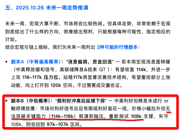 Hey everyone!The market situation in the past week is just as we said in the last issue, "the macro is waiting for the wind to come", and the market is in a wait-and-see mood:The price continued the volatile trend of the past two weeks and continued to see sideways between the long and short defense lines of 106k–116k., trading volume continues to decline, and on-chain liquidity indicators and futures leverage are also cold. Although the macroeconomic benefits continue to be positive (Federal Reserve rate cut + Sino-US easing + US stock market rise), the market performance was mediocre last week. Two attempts to reach 116k ended in failure. Moreover, if you look closely, US capital is quietly withdrawing. Is this brewing a bigger crisis? Let’s analyze it carefully in this issue. 1. Market review of last week (10.26-11.02)Let me first review the prediction I gave last week (10/26). The actual trend is biased toward script B mentioned last week: On October 27th and 28th, after two failed attempts to hit 116k, the rebound power ran out, and the backtest 106k found support, and the price fluctuated sideways around 110k. ![]() (Click on the picture to review last week’s weekly report) ![]() And if you look closely at the line pattern, you will see that the two impacts on 116k both showed obvious upper shadows and the condition of Maker deteriorated, which are both short-term bearish signals. Operation review: Continuation of last week’s discipline——126k currency-based long-term short orders continue to be held, no short-term gambling (no direction bet, 114k is available but Maker's condition has deteriorated). ![]() 2. Recent macro situation:2.1 Main macro data this week: