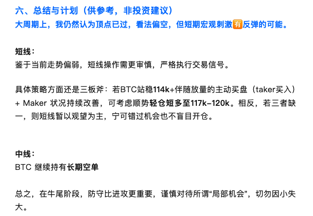 6. Summary and plan (for reference only, not investment advice)General direction: The bull tail structure has not changed - I maintain the tone of "there is a rebound, but it is difficult to reach a sustained new high";The main line of shorting remains unchanged, longing only relies on tactical rebounds。 Short term (tactical position) Bull trigger three elements Only to participate in: