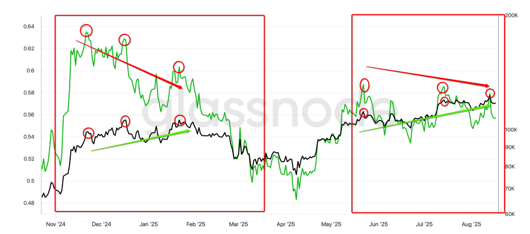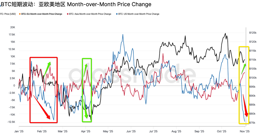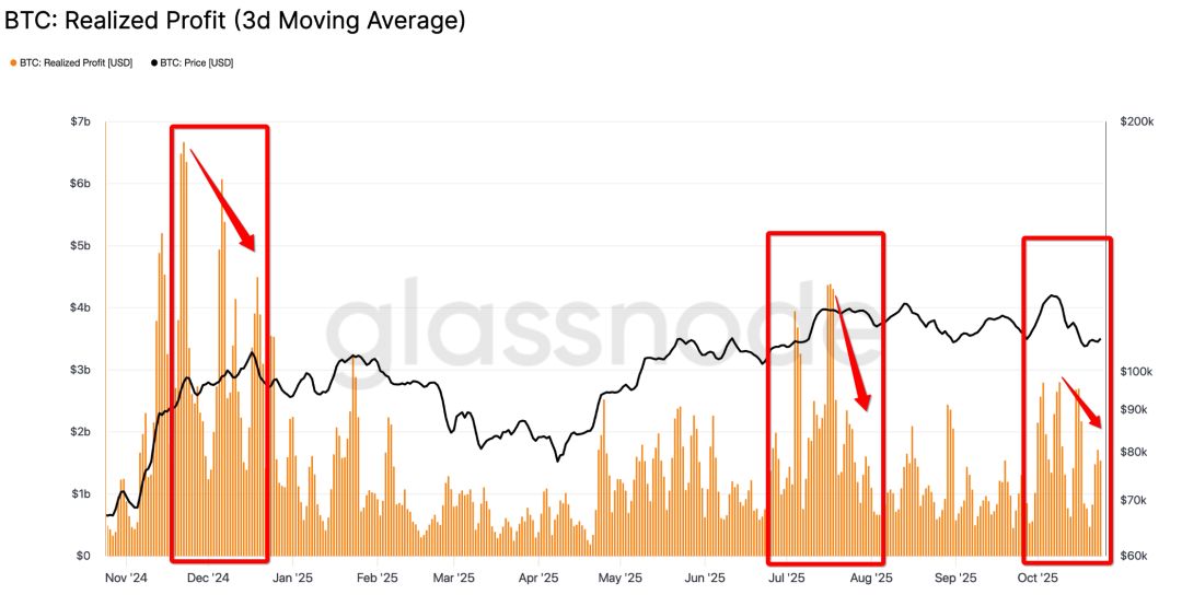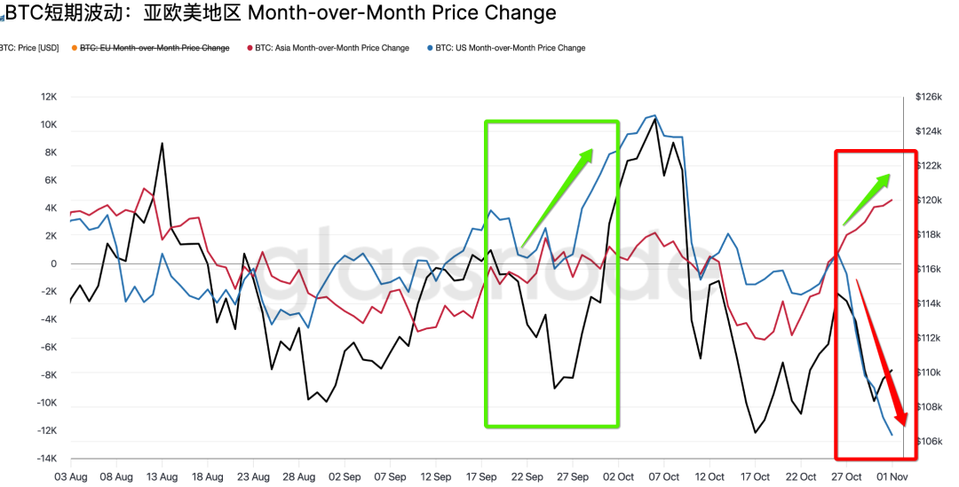 In short, in the past week, when the overall macro trend was favorable, the price of the pie fluctuated downwards. This is a signal worthy of focus! 3. On-chain data analysis3.1 Liquidity situation:Spot ETFs:![]() As shown in the figure above, overall last week, ETF funds returned to net outflows, with a total net outflow of US$260 million. Are big institutions selling the FACTS? Or have other concerns? This week's ETF stance needs to be focused on. Exchange stablecoin inventory:![]() As shown in the picture above, the blue line is the supply of stablecoins on the exchange, and the black line is the BTC price.Last week’s trend (red box in the picture above) saw price fluctuations, but the stock of stablecoins continued to increase, which is related to the crazy bargain-hunting of Asian funds that we will talk about later.Futures open interest![]() As shown in the figure above, the black line is the BTC price, the yellow line is the number of BTC futures open contracts, and the red line is the contract funding rate. Last week's trend (red box in the picture above) shows the uncertainty and recurrence of market direction. The overall leveraged funds are at a low level in half a year, but the funding rate is still above 0, indicating that the current bullish sentiment continues.3.2 Chip structure on the chainURPD(UTXO Realized Price Distribution)![]() From the perspective of chip structure, chip concentration has increased again. Currently, more than 2.5 million BTC are concentrated at the position of 104-113k (red box in the picture above). Currently, long-term holders are selling like crazy (long-term holders sold 300,000 BTC in October, the highest value in a single month in 2025), and chips are concentrating upward. Every increase in chip concentration increases the risk of volatility. It is foreseeable that the price will fluctuate violently in the future, but whether it will be upward or downward cannot be accurately judged. 4. “Escape from the Top 2025” Monitoring Panel This recently added weekly report module. We hope that through on-chain data analysis, we can successfully escape from the top of the recent market.BTC net realized profit:![]() As shown in the figure, the orange column represents the daily cashing profit of BTC. (As shown in the red box in the picture above), when profit realization shrinks, it means that the new market demand is not enough to undertake greater profit realization, indicating that demand is weakening, which is a bearish signal for the big weekly period⚠️. 4.2 Does relative unrealized profit form a top divergence? BTC relative unrealized profits: ![]() As shown in the figure, the black line is the price of BTC, and the green line is the relative unrealized profit, which is used to measure the proportion of unrealized profits in the overall market, that is, the unrealized profit status of investors holding BTC in the market. When prices continue to rise but relative unrealized profits decline, there is only one possibility: someone cashed in their profits and ran away first! When more people cash out their profits and flee, and subsequent new entry funds are insufficient, prices will be unable to sustain and begin to fall. From the tops in December last year and January this year, we can see the divergence between price and unrealized profits (red box on the left side of the chart above). When the BTC price hit a new high recently on 8.14, the green line did not exceed the previous high, and a second decay occurred that perfectly triggered the warning signal ⚠️. Asia-US trading hours price momentum: ![]() As shown in the figure above, the black line is the BTC price, the blue line is the US capital momentum, and the red line is the Asian capital momentum. The trend last week was very strange. Rarely have there been such big differences between US capital and Asian capital. U.S. capital has been retreating last week, while Asian capital has been frantically bargain hunting (red box in the picture above). There is a saying that last week's correction was just "selling the facts" after the interest rate cut, just like after the interest rate cut in September this year, there was a short correction, and then the market rushed out of ATH. However, it is worth noting that in September this year, US investors have been leading Asian investors in adding positions (green box in the picture above). As for the large-scale withdrawal of US capital last week, although we don’t know the reason, their actions are worthy of vigilance! ![]() Such huge differences between American capital and Asian capital have occurred twice this year. The first time was in February this year (red box in the picture above). After the US capital withdrew, Asian capital bought the bottom, but then BTC plummeted. The second time was in early April this year (green box in the picture above), when the trade war started, and Asian capital bought the bottom and American capital withdrew. This time, Asian capital was obviously better. The third major disagreement currently, which one do you think it will be like? My personal opinion is more inclined to February this year. In short, after writing about the escape from the top for so many periods, it now seems that various indicators indicate that the top area of the bull market in this wave of market since May has basically passed. There will definitely be a rebound in the future. Without huge macro changes (huge quantitative easing, etc.), it seems that the possibility of significantly breaking the previous high is very small at present. 5. 2025.11.2 Trend Deduction for the Next Week To sum up, I still maintain the current oxtail cycle judgment. Therefore, in the oxtail market, the trend is confusing and defense is the main focus. List 2 possible market scenarios for the coming week: