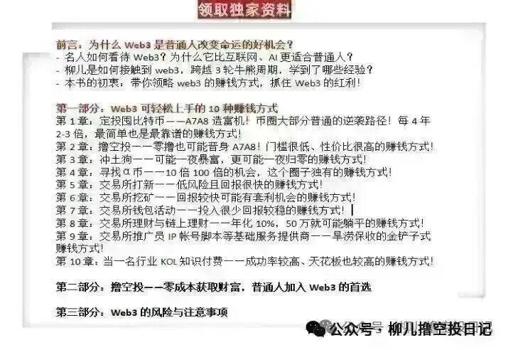 Cai Lam once said: It must be done as soon as possibleEarn 1 million, this is our first step away from the life of cattle and horses. in your possession 1 million ago,All hobbies should be about making money. This is really a very insightful statement from the bottom of my heart. So, let those big cutters go, we don't care, we only care about combing our hair and making money. Liu Er, an old leek born in the 1980s who has been hoarding coins for 7 years, experienced 3 bull and bear rounds, and made 6-digit profits. At the beginning of last year, I resolutely gave up web2 network entrepreneurship and went all in on web3 airdrop. 400+ hair-raising diaries, recording the whole process of learning, growing and challenging A7. There are already 1,100+ members in the furry companion group, and you are welcome to join (suitable for newcomers who can follow our tutorials and learn on their own)!
