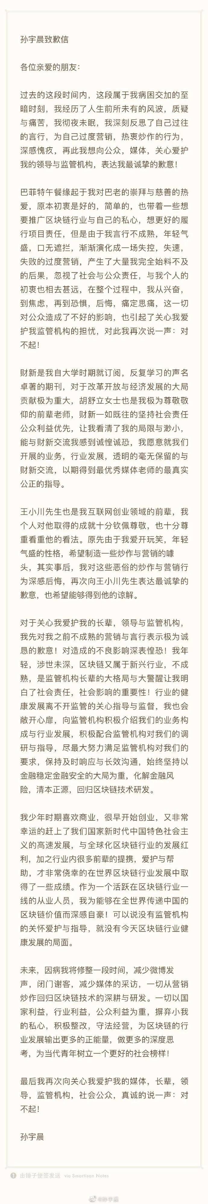 ![]() Two days after announcing the cancellation of the lunch with Buffett, Sun Yuchen issued an apology letter on Weibo today. Regarding the Buffett lunch, he said that he has experienced unprecedented turmoil in his life during this period. Due to his immature words and deeds, youthful energy, and unrestrained words, it gradually evolved into an out-of-control, stalled, and failed over-marketing. In the letter, Justin Sun also apologized to Mr. Wang Xiaochuan, CEO of Sogou, and said he deeply regretted these vulgar hype and marketing behaviors and hoped to gain his understanding. Sun Yuchen said that due to illness, he will take some time off in the future, reduce his Weibo posts, thank guests behind closed doors, reduce interviews with the media, and return to the deep cultivation and research and development of blockchain technology from marketing hype. In the past 48 hours or so, Justin Sun has made waves in the currency circle and the Internet field. ●At 5:49 a.m. on July 23, Justin Sun posted on Weibo that he had canceled his lunch meeting with Mr. Buffett. Regarding the reason for the cancellation, Sun Yuchen said that he was being treated in the hospital due to a sudden kidney stone. His current physical condition is stable and he is in the recovery period. He is unable to be interviewed. Please forgive me. ●At noon on July 23, in response to media reports that Sun Yuchen’s cancellation of Buffett’s lunch was suspected of illegal fund-raising, money laundering, pornography and gambling, Sun Yuchen posted a response on Weibo saying that the pictures of the conversation posted online were not true and were all photoshopped.; It is false to report illegal fund-raising and money laundering online. Sun Yuchen said that Peiwo App is a voice social product used by young people. As a platform, we are firmly opposed to some negative energy content generated by users on the platform and will cooperate with regulatory agencies to carry out network clean-up operations as soon as possible to improve the quality of supervision. However, is the Paiwo APP that Justin Sun is so proud of really legal and compliant? As early as June last year, Xinhua News Agency named Paiwo APP when investigating the spread of pornography on the live broadcast platform to the audio live broadcast platform. The anchor encourages listeners to reward and buy gifts for listening to provocative content. According to 21st Century Business Herald, the Peiwo APP has been removed from the App Store. Some netizens broke the news that Paiwo APP has been full of pornographic information and even paid pornographic escorts. It was not until after the announcement of lunch with Buffett that the pornographic content was removed. The latest news is that through the National Enterprise Credit Information Publicity System, it was found that the main company of Peiwo APP, "Guangzhou Peiwo Information Technology", is making a creditor announcement and plans to apply for deregistration due to the resolution to dissolve. ●At around 23:00 on July 23, Caixin reported that Justin Sun, the founder of the TRON Foundation, has been placed under border control, and the Mutual Finance Regulation Office has recommended that the public security file a case against him. ●In the early morning news of July 24, Sun Yuchen posted on Weibo late at night in response to the border control issue. He said that Caixin.com’s report is completely untrue. I am fine and will meet the outside world after my condition recovers and improves. This worries everyone. ![]() He also started a live broadcast on Twitter to prove that he was in San Francisco. During the live broadcast, he also said "Everything is ok" and "I'm feeling better". It can be seen from the picture that behind Sun Yuchen is the Oakland Bay Bridge (Bay Bridge), a landmark building in San Francisco. Previously, according to Caixin reports, Justin Sun, the founder of the TRON Foundation, has been placed under border control, and the Mutual Finance Regulation Office has recommended that the public security organs file a case against him. It is understood that Sun Yuchen was not on the watch list of regulatory agencies before, but because of his relationship with Buffett and continued speculation, he came into the sight of regulatory agencies. ●On the morning of the 24th, Sun Yuchen posted on Weibo to respond to the cancellation of Peiwo App, saying that company establishment and cancellation based on commercial considerations are normal business behaviors and do not need to be over-interpreted. The establishment of a new entity and the dissolution of the old entity will not affect normal business operations. The National Enterprise Credit Information Publicity System shows that Guangzhou Peiwo Information Technology Co., Ltd., which is wholly owned by Sun Yuchen and serves as the legal representative, is making a creditor announcement. The announcement period is July 18, 2019 - September 1, 2019. The rights holder announcement information shows that on July 18, 2019, Guangzhou Peiwo Information Technology Co., Ltd. was disbanded due to a resolution and planned to apply to the company/farmer professional cooperative registration authority for deregistration. Creditors are requested to 45 days from the date of announcement. Report claims to the liquidation team within the day. The creditor is Accompanying Joy (Beijing) Technology Co., Ltd. ●On July 25, Justin Sun issued an apology letter on Weibo today. ![]() Since announcing the successful bid for Buffett's lunch at a sky-high price of US$4.56 million (approximately RMB 31.42 million) on June 4, the controversial post-90s generation has made many hot searches for contracting: Wang Sicong, Sogou CEO Wang Xiaochuan, photographing Buffett's lunch, and refuting rumors that Buffett's lunch was cancelled. In February this year, Sun Yuchen announced on Weibo that he would spend 10 million to support Zhao Yu. Recently, he also said that he w