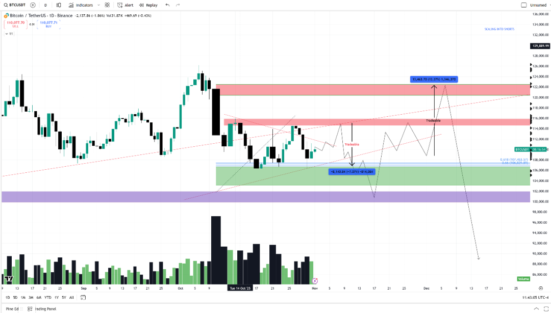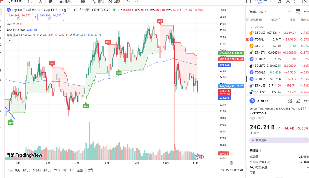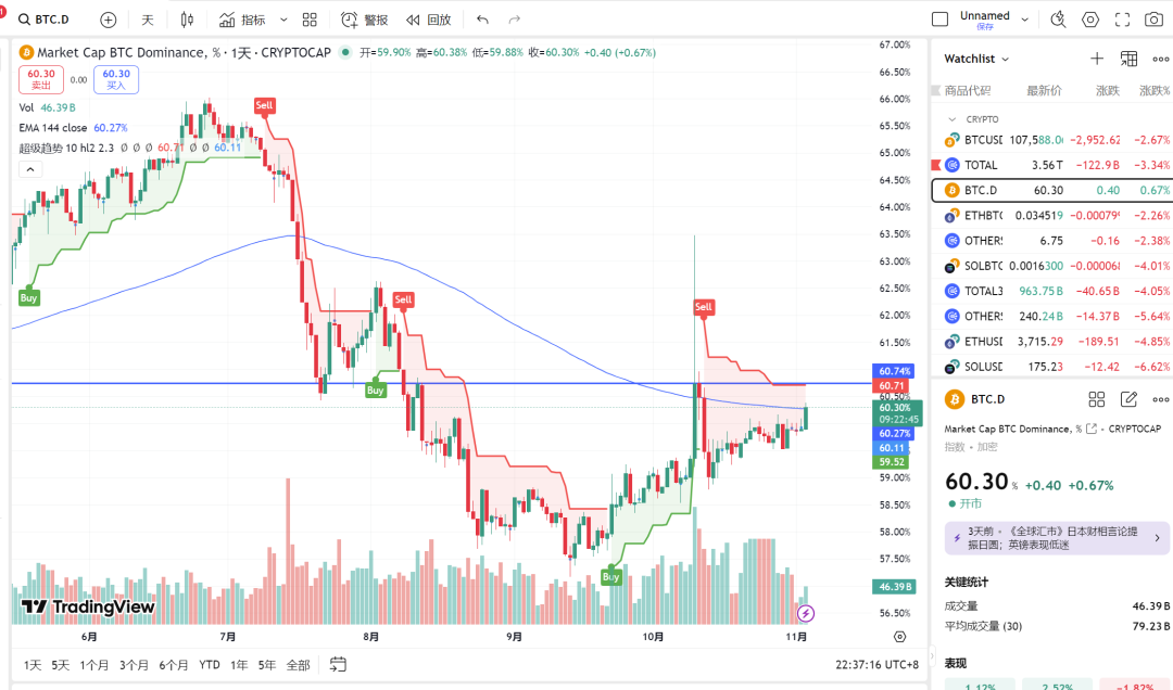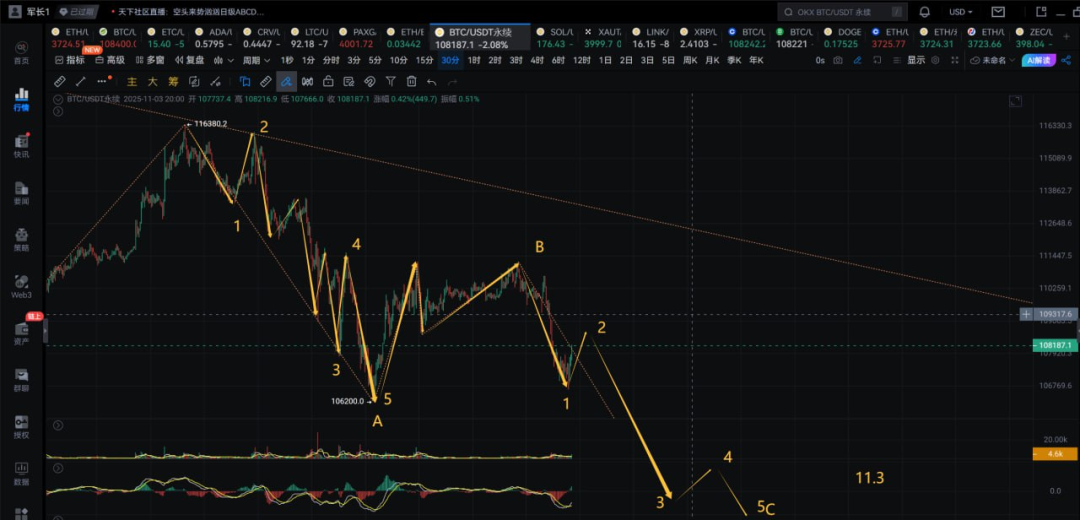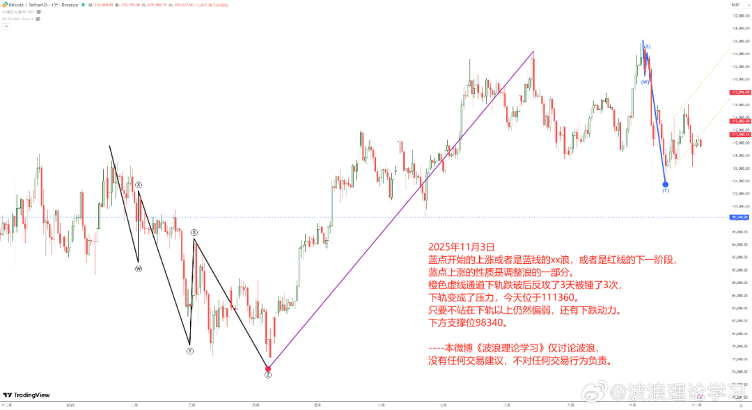 1. Quick currency market trend 1. Altcoin market ![]() Excluding the top 10 altcoins in terms of market capitalization, the daily chart of the total market value shows that the support level is repeatedly tested near 235B. If it falls below 210B, it means that the overall altcoin will fall by about 15%. 2. BTC.D Bitcoin market capitalization share ![]() BTC.D accounts for 60.3% of the Bitcoin market value. It has pierced the pressure level of 60.27%. We will see if it really breaks through after closing the daily line tomorrow. If it does, the altcoin will continue to fall for a long time. 3. Liquidation heat map ![]() Judging from the recent liquidation heat map in January, there is still some long liquidity at 103-106K, and short liquidity is around 112K. 4. Panic and Greed Index ![]() The panic-greed index is 36. 5.1H Time Frame: Analysis of Multi-School Trading Strategies ![]() Screenshot time: 22:45 Beijing time on the 3rd. 2. Speed pass of currency bloggers1. Top Trader Pigeon Eugene Ng Ah Sio (Pigeon has not been updated) 2. Top trader Nachi Updated at 2:13 on November 1, Beijing time: My system once again gave a strong bearish signal and I have turned bearish towards the end of the year. I think $BTC and $ETH are likely to break downwards after experiencing another period of volatility and retest 90K and 2800. Bitcoin did not respond positively to top-level positive news such as the "trade agreement", which is a huge warning sign - it shows that there are still a large number of sellers selling on highs, whether they are old players who have reduced their positions based on the "four-year cycle theory", or market makers, traders or funds who were injured in the October 10 plunge. There is also uncertainty about whether interest rates will be cut in December, so fund managers in traditional finance may choose to lock in profits for this year, triggering a market correction. As stocks rally, crypto markets fall; When stocks pull back, crypto markets are ________. (Nachi is bearish on the crypto market until the end of the year, believing that BTC has fallen so much before the stock market has started to correct, and will fall even more when it corrects later. ) 3.Trader Vivian BTC long-term analysis: Updated at 8:15 on November 1, Beijing time: The monthly closing line is quite strong, so don’t worry too much about the short-term price trend. The shock will continue until the government reopens, but it doesn’t matter, the spot price is still safe. Next major top: 114K-115K, Next major buying range: 104K-105K Final exit position (before "destruction"): 122K, not 132K. The "destruction" here does not necessarily mean a plunge, but more like the beginning of a period of stagflation. The market value was 4.4 trillion, BTC was at 122K, and ETH was at 4400. They all left the market. Maybe it can rise a little further, but if it does, wait until the annual line is closed before re-opening a position. The current plan is to completely exit the spot market around Christmas when the total market value reaches 4.4 trillion. Updated at 23:43 on November 1, Beijing time: High time frame charts: ![]() BTC short-term market analysis: Updated at 8:03 on November 3, Beijing time: ![]() These three are clearly tradable market segments. The red box is tomorrow’s short entry range: 111.5K – 113K. We will end this short order at 107-108K, but we need to pay attention: the market may drop as deep as 104K. The operation plan is as follows: 1) All long orders (currently XRP, some people should hold ETH, stop loss at cost price) All prices will be closed around the NY open tomorrow. 2) Short orders will be gradually scaled in starting from NY lunch. 3) All short orders will be closed at 107-108K. 4) BTC already has a pending limit order (will be announced when short-term stop loss is issued), I'm still deciding whether to go market or limit as I expect a deeper drop may be possible. 5) November 7th is the Gann reversal day, and the shock is likely to end at that time. above. Be patient and wait for my next instructions. (Vivian believes that BTC will rebound in the 104-106K range. She plans to go short to 107K, and then look for opportunities to backhand and go long. ) 4. Top trader Reetika Updated at 16:45 on November 3, Beijing time: The timeline is getting increasingly bearish, which is understandable, after all, the recent price action has been really bad. Although I expected volatility, I didn’t expect some altcoins to hit new lows after October 10th (cough cough XPL cough cough). I still stand by my original plan and think this painful swing will eventually resolve to the upside unless we materially break below 100,000. Now is the time to be patient, get out in the sun more, and let the market speak for itself. ![]() The picture above was released on October 17th. (Reetika believes that BTC has not turned bearish until it falls below 98K. ) 5. Trader Commander Updated at 16:43 on November 3, Beijing time: I drove for a while in the morning and saw that the price was rising quite well. I went out to wash my car and buy groceries with peace of mind. When I came back, I saw that the price had returned. I thought it was normal consolidation at first, but after a closer look, it turned out that the price was too fast and penetrated the indicator. Therefore, I made the judgment that the big C wave should have started to fall in advance and let everyone chase shorts. The first target of the big C wave is below 103000, and short orders can be entered in batches above 108000. Detailed picture update: ![]() At present, only the C1 wave has been completed, and it has entered the C2 wave consolidation, followed by the main falling wave. Still mainly empty (The military commander and Liu Yudong below belong to the wave theory school, and he has been bearish recently. ) 6. Wave Theory Liu Yudong ![]() November 3, 2025 The rise starting from the blue point is either the XX wave of the blue line, or the ne