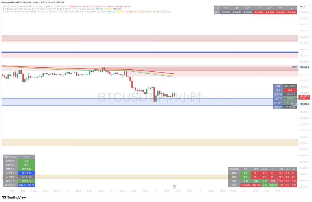 ![]() (Today’s market analysis) Today's market analysis 2025.11.4 ![]() BTC Current price: $107,000 ![]() Intraday analysis 1️⃣ Structural interpretation The technical picture has turned red and market confidence is very fragile. The current core task is to observe whether the price can stabilize its position above $100,000 and rebuild its defense line. Under the current situation, I don’t recommend taking long positions. Bitcoin is currently in a pattern of short-term structural weakness. The daily red moving average has fallen below. A second confirmation is required here. Be careful! 2️⃣ Capital flow & on-chain & exchange dynamics
