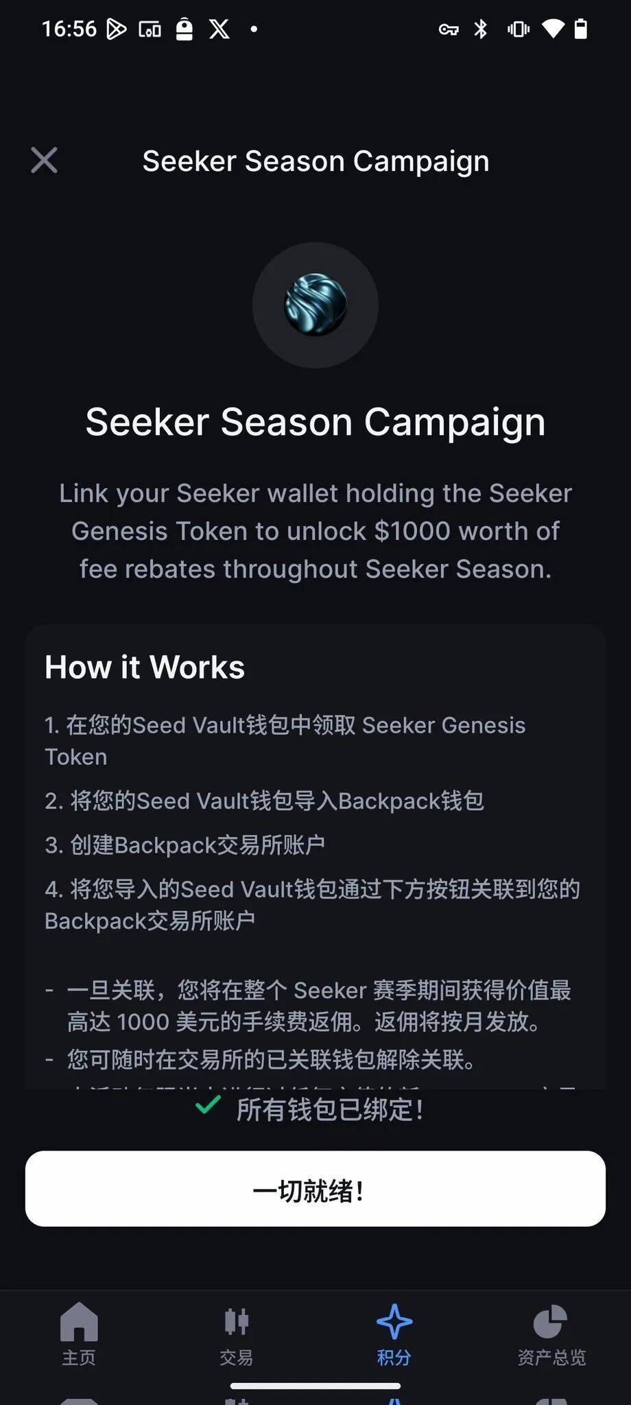 ![]() 2. How to participate (official process) 1️⃣ Activate Seeker. After the mobile phone is activated, the system will automatically generate a mobile wallet and mint a Seeker Genesis Token (an exclusive NFT bound to the wallet, used to identify rights and interests). 2️⃣ Download Backpack Wallet App Backpack is a wallet and trading platform under the Solana ecosystem, integrating asset management and trading functions. 3️⃣ Import wallet Open Backpack → Wallet → Use mnemonic vault → Select “Seeker Seed 1” to complete the import. 4️⃣ After registering the Backpack trading account and importing the wallet, select "Seed Vault 1" in the upper left corner, click "Add Trading Account" to enter the registration page. ⚠️Be sure to register through the Backpack official website or App download channel, and beware of phishing websites. After completing the above steps, the handling fee reduction amount will be automatically bound to the account. 3. Activity Background Backpack Exchange will launch the third quarter points program on September 11, 2025, which is expected to last 8–10 weeks. 📅 Distribution time: 10:00 every Friday (UTC+8) 📊 Calculation rules: Automatically calculated based on the transaction activity of the previous week 🏅 Level system: From Bronze to King, the higher the level, the more rewards 🎁 Potential incentives: Points may be linked to subsequent platform rights (such as incentive activities) and users holding Seeker Creation Tokens can qualify for additional handling fee reductions in this season’s points plan, further improving the cost-effectiveness of the activity. 4. Participation Instructions