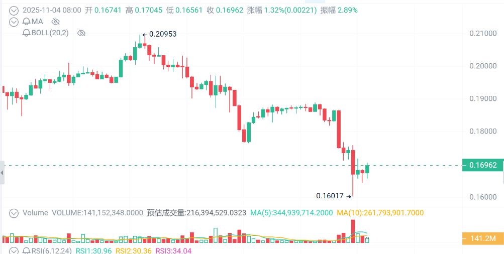 The crypto market has been experiencing severe volatility again recently. Meme currency leader DOGE plummeted 8% amid huge whale selling, while XRP is trying to stabilize its position amid continued volatility. Although the trends of the two are different, they both reveal a key signal: the market is undergoing a phase of deleveraging and structural adjustment.Next, we will comprehensively dismantle the market trends of these two major currencies from three perspectives: background, technical aspects and trading psychology. 🐕 Dogecoin plunges 8%: whale selling triggers chain collapse1. Market background: Giant Whale shipped US$440 million DOGEOn Tuesday, Dogecoin experienced its most violent sell-off this year. The price once fell from $0.1843 to $0.1697, an intraday drop of more than 7%. ![]() On-chain data shows that large addresses holding 10 million to 100 million DOGE sold approximately 440 million tokens, worth approximately US$440 million, in just three days. This directly triggered a chain reaction in the market - trading volume soared to 3.37 billion DOGE, more than 400% higher than usual, and stop-loss orders were triggered one after another, forming a waterfall decline. 2. Key support: $0.165 is the life and death lineDOGE had previously formed a strong support area near $0.18, but this round of plummeting has completely penetrated this line of defense, and the structural break is very obvious. “If the price can stabilize above $0.165, there may be a chance for a technical rebound in the short term; However, if the daily chart fails to close above $0.18 again, the bearish trend will still dominate the market. ” ![]() The RSI indicator has fallen to 34.7, entering historically oversold territory, which usually means a short-term rebound is possible, but the broader trend remains bearish. In addition, futures trading volume surged 50% to US$5.25 billion, but open interest fell 4%, indicating that the market is deleveraging, not that new funds are entering the market. 3. Technical aspect: The rebound space is limited, but the selling pressure is still strongThe current price structure of DOGE is in a typical downward channel, with short-term resistance at $0.1760-0.1800. Intraday data shows that the selling was most intense between 03:00 and 05:00 UTC, with peak trading volume exceeding 1 billion DOGE. The rebound attempt was met with strong selling pressure near $0.176, showing that institutions are still allocating chips at a high level. Analysts generally believe that stabilization above $0.165 is a "bleeding point" and a breakthrough of $0.18 is a "recovery signal." 💧 XRP: Range Compression, Calm Before Breakout?1. Current trend: up 2.75%, lagging behind the marketIn contrast to DOGE’s plunge, XRP has inched up 2.75% to $2.34 in the past 24 hours, but overall performance still lags behind the crypto market average. Trading volume fell 6% from the 7-day average, indicating low institutional participation. Prices reached as high as $2.51 during the session before falling back and stabilizing around $2.33. ![]() 2. Technical pattern: Descending triangle suppresses breakthroughsXRP is currently consolidating between the support zone of $2.30-2.35 and the resistance zone of $2.60-2.72. The key level to watch is $2.54, a break above which could signal a shift in market direction. However, XRP is still technically suppressed by the descending triangle, and the EMA moving average band has also closed, suggesting that a volatile event is coming. 3. Investors are concerned: support remains stable or breakthrough is imminentTraders generally agree: