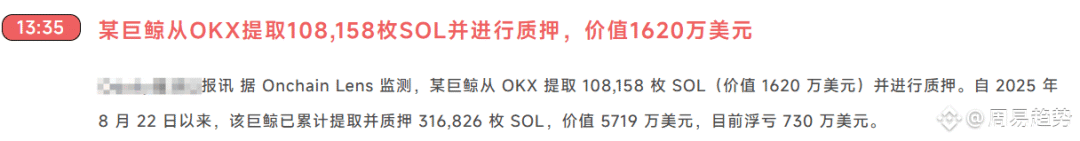 Friends, I am Zhou Yi. A fan just sent the SOL market chart and asked anxiously: "Brother Zhou, SOL has fallen like this, and the bottom has been diverged. Can you buy the bottom?" "I found that many people have little understanding of technical indicators, so today I will break them down and explain them clearly to everyone. Let’s look at the news side first: the news side hides a big secret! ![]() Just now, on-chain data showed that a whale withdrew 108,158 SOL from OKX for pledge. Sounds like a good thing, right? But a closer look shows that this giant whale has pledged a total of 316,826 SOL since August 22, with a total value of US$57.19 million, and the current floating loss is as high as US$7.3 million! what does that mean? Let me explain it to you: First, the giant whale is trapped. The floating loss of US$7.3 million is like a sword hanging above the head, which may trigger panic selling at any time.; Second, although a large amount of pledges reduces the circulation, it also shows that whales dare not easily move these coins in the short term, and the liquidity is actually getting worse.; Third, and most importantly, this exposes the fact that big funds are also trapped, indicating that the downward trend may not be over yet. Let’s look at the technical side: ![]() The current SOL quotation is 155.30, and there is indeed a "bottom divergence" on the one-hour line - the MACD white and yellow line has a golden cross below the 0 axis, but the price is still hitting new lows. This is like a person who is exhausted but still pushing forward. It usually indicates that a short-term rebound may occur. The key positions are clear: