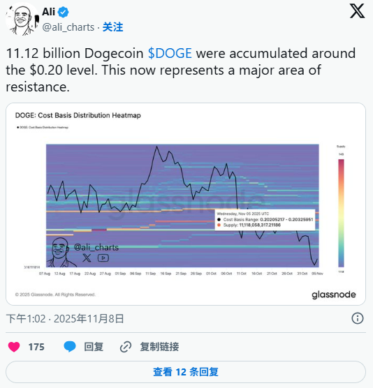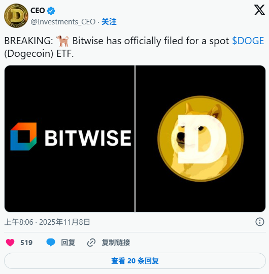 Recently, Dogecoin (DOGE) has been “ignited” again In just 24 hours, the price climbed from $0.17, an increase of nearly 8%, and market sentiment significantly improved. The driving force behind it is likely to be the news that the Bitwise spot Dogecoin ETF is about to be launched - expected to be listed on the New York Stock Exchange (code: BWOW) in late November. ETF approaches, market optimism risingBitwise has submitted its fourth revised S-1 filing to the U.S. Securities and Exchange Commission (SEC), initiating the 20-day automatic approval process. If the SEC raises no objections, the ETF will be approved by default, and investors will be able to hold Dogecoin directly through the ETF. Custody is provided by Coinbase Custody, and all key details (fees, transaction codes, etc.) have been finalized. This means that Dogecoin is getting closer and closer to entering the mainstream market. ![]() A gathering area of 11.12 billion DOGE, where whales frequently appearFrom the perspective of cost basis distribution, 11.12 billion DOGE was bought near $0.20, forming a strong resistance area. This means that it will not be easy for the price to break above $0.20 in the short term, but once it does, the potential upside is still large. ![]() Technicals show bulls have the upper hand