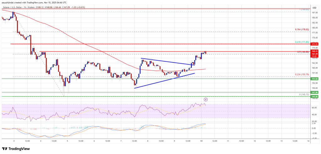 ![]() Solana shares are starting to rebound after breaking out of the key $162 area. SOL price is currently consolidating and facing resistance near $172.