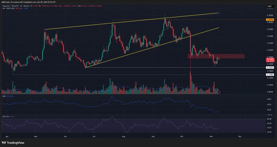 Dogecoin Price Prediction Shows Bearish Signal After Drop to $0.18; The price is expected to drop to $0.15-0.13. What is the near-term price prediction for Dogecoin?Dogecoin price The downward trend emerged after finding resistance at $0.18, indicating continued seller dominance on the daily chart. Declines in indicators such as open interest and balance-of-volume (OBV) also reinforce this downtrend, with potential price targets at $0.15 or even lower as low as $0.13. A sustained move above $0.209 could overturn this expectation and signal a price reversal. Why Dogecoin’s Technical Indicators Show a Bearish Structure?Dogecoin’s daily chart shows a clear descending structure characterized by lower price highs and lower lows, and this downward trend continues despite a brief surge in social interaction. According to TradingView data, the Balance of Volume indicator (OBV) continues to move lower, reflecting the recent weakening of buying pressure and increased selling activity. This is also confirmed by the Money Flow Index (MFI), which is currently in oversold territory but has yet to show signs of reversal, indicating that sellers are still in control. Dogecoin backtested around $0.18 over the past week but failed to break out, with previous support at this level now turning into resistance. Historical data shows that such pullbacks often herald deeper adjustments. According to data from CoinMarketCap, the overall Dogecoin market has fallen by 31% in the past month. Analysis on lower time frames shows that Dogecoin continues to face liquidation risks, further exacerbating the downward trend. Cryptocurrency technical analysis experts, such as those mentioned in market reports from platforms such as CoinGlass, stressed that Dogecoin prices could fall further without a surge in volume to break this structure. The combination of these indicators provides a structured perspective for traders monitoring short-term trends. FAQIs there evidence that market sentiment has turned bullish for Dogecoin?There is currently no conclusive evidence that Dogecoin prices will trend upward. While Elon Musk’s recent posts on the X platform sparked a brief social media buzz and led to a small price rebound, the buzz was short-lived and failed to offset the overall downward trend shown by price action and derivatives data. What should Dogecoin traders expect in the coming trading days?Dogecoin traders should note that the resistance zone of $0.18-$0.19 will continue to be under pressure. If it falls back, the next support level may be $0.15 and $0.13. Keep a close eye on open interest and volume, as selling pressure will intensify once these indicators fall below. The resistance at key support levels highlights the bearish outlook for Dogecoin.![]() Recent market dynamics have confirmed the bearish predictions for the price of Dogecoin, with the asset indeed approaching $0.15, in line with last week’s predictions. As of press time, the one-day chart shows that Dogecoin has encountered significant resistance near $0.18, indicating that bears are still dominant and that no positive catalysts have yet emerged. Once a reliable support level, this price level has now become an insurmountable obstacle, and the weakness in the entire memecoin sector has exacerbated the situation. Open interest in Dogecoin futures fell by 3.66% in the past 24 hours, coinciding with the 2.67% price decline, indicating weakening trader confidence and increasing short-term bearish sentiment. Data from CoinMarketCap shows that the entire memecoin market, including Dogecoin, has lost 31% of its market value in the past month, highlighting systemic stress rather than isolated incidents. From a technical perspective, the daily chart shows a strong bearish structure, with the OBV indicator also showing a continued downward trend, reflecting reduced capital accumulation. Similarly, the MFI indicator shows that sellers are dominant and fund flows are biased towards distribution. Together, these indicators suggest that the current situation is favorable for the downside and if momentum builds, the price could fall back to $0.15 and test further towards the $0.13 support area. However, traders should note that if the price is able to effectively break above $0.209, it could break this bearish trend and potentially shift market sentiment towards a rebound. This analysis draws on technical frameworks commonly used in cryptocurrency trading to provide a data-driven perspective on Dogecoin’s future trends. Liquidity data suggests a final opportunity for a short squeeze may be emerging.![]() Analysis of the two-week liquidation heat map shows that liquidity is concentrated around $0.19 and $0.204, areas prone to short liquidations that could trigger a brief upward squeeze before a sustained decline. Data from CoinGlass shows that these areas are hotspots of potential volatility, and over-leveraged positions could push prices higher. For Dogecoin price watchers, this means that the price could rebound to these levels, but this should be seen as an opportunity for sellers rather than a sign of a trend reversal. What needs to be focused on is the one-day OBV indicator ; Bullish divergence or a crossing of the zero line by the OBV indicator could signal an uptrend, especially if the price breaks above $0.209. In the absence of such signals, the current bearish structure dominates and the risk of a downside move to $0.13 outweighs the upside potential. This liquidity-based analysis is consistent with broader derivatives market behavior, where falling open interest often signals a sharper pullback for assets like Dogecoin. Traders are advised to be cautious about any short-term rallies and take advantage of these bounce opportunities to position for expected downside targets. Taken together, these factors suggest that Dogecoin should move with caution in the current market environment. Summary of key points