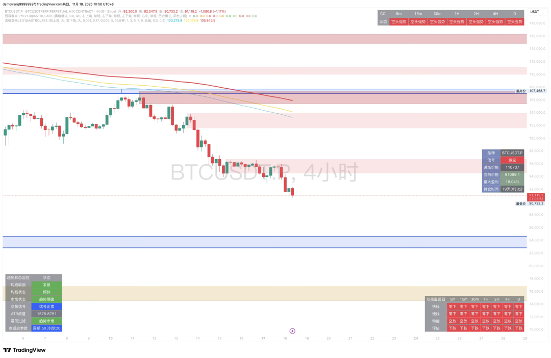 The radicals are unable to attack near 95,000, and there are stagflation K-line patterns such as long upper shadows and bearish engulfing. You can consider short positions and follow the trend. Moderate faction, one hour is the best time to start. I have to suggest that "no operation" is the best operation. Keep plenty of cash and wait for the market to give clear signals of stopping the decline and stabilizing.