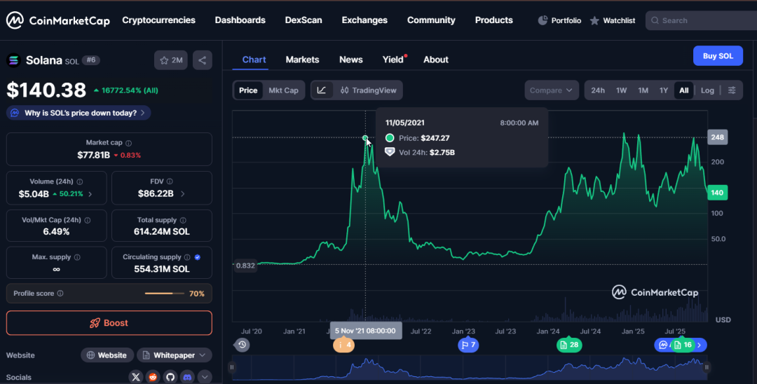 SOL price trend (From https://coinmarketcap.com/currencies/solana/)
