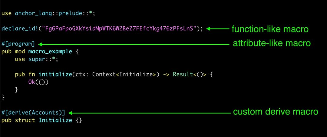 In Solana, a major feature of Programs written in Rust is the use of macros (usually accompanied by!, such as msg!, println!), including: