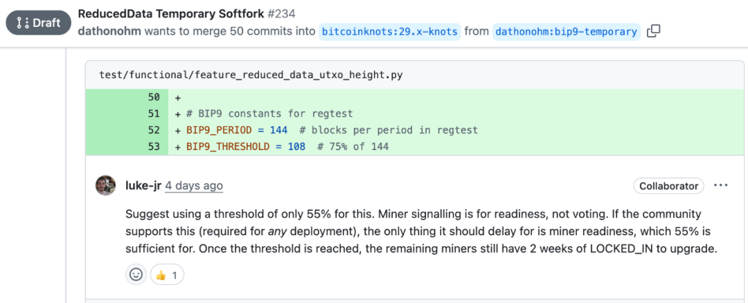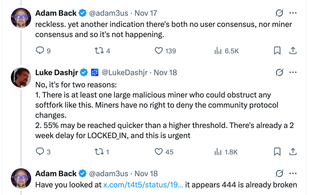Tips: Ask Jiao Lian, give it a try 👉 [Liu Jiao Lian has questions and answers]. Search for historical articles on the teaching chain and click on the public account card below (🔍 icon in the upper right corner) * * * Jiaolian's ["Bitcoin History"] Chapter 76: The Fork War This chapter records several major fork events in the history of BTC, especially in the 2017-2018 cycle. The two most famous hard forks are the BCH fork on August 1, 2017 and the BSV fork on August 16, 2018. Below, Jiaolian compares the chapters in the book with the price chart of BTC that year. ![]() Strictly speaking, BCH is a hard fork from the BTC main chain, while BSV is a hard fork from the BCH main chain. BTC is the father, BCH is the son, and BSV is the grandson. Since the BCH hard fork in 2017, BTC has not actually undergone a hard fork so far. Some upgrades and improvements are also completed in the form of soft forks. A typical example is as recorded in the article ["Taproot has been activated: It's not that Bitcoin evolves slowly, but that we evolve slowly"] on November 15, 2021, that the taproot upgrade was successfully soft forked. A classic soft fork standard is BIP-9. BIP-9 uses a certain bit in the version number field in the BTC block header to indicate the miner vote for a certain soft fork version. Starting from the set voting start time, the voting progress will be evaluated every interval of the mining difficulty adjustment period (about 2016 blocks, about 2 weeks). When the support signal ratio exceeds 95%, it is deemed to have obtained enough computing power support and enters the LOCKED_IN locked state, ready for formal upgrade. After another difficulty adjustment cycle (approximately 2016 blocks), the status changes to ACTIVE, declaring the upgrade successful. Otherwise, if a sufficient proportion of support signals cannot be collected after the preset timeout period, the upgrade will be declared failed. Back then, Segregated Witness successfully completed the soft fork upgrade using the BIP-9 process. However, the process of BIP-9 is very long, and it takes a long time (sometimes as long as a year) to complete the voting, and the voting threshold required for passing is also high (95%). Therefore, the taproot upgrade at the end of 2021 did not adopt BIP-9, but adopted a variant called Speedy Trial. The quick voting method only takes 3 months and can be completed with 90% computing power support. The camera zooms back to today. Under the pressure of community criticism, the maintainers of Bitcoin Core insisted on merging and releasing the code that relaxed the size limit of the data carried by OP_RETURN. This is the Core V30 version, or Core30. The June 8, 2025 Jiaolian article ["Bitcoin Core Development and Transaction Forwarding Strategy"] compiled the Bitcoin Core maintenance team's defense of its decision. June 10, 2025 Jiaolian article ["Beware! Bitcoin Core has been merged with PR#32406"] introduced that the Bitcoin Core maintenance team has insisted on merging the relevant code, and the release has become an established fact. In that article, Jiaolian wrote: “Jiaolian can’t help but worry that this forceful action by the Bitcoin Core maintainer team will cause a tear in the community consensus and cause a deeper impact and damage to the value of BTC, just like the hard fork over the block expansion dispute in the second half of 2017 caused short-term strong pain to BTC. It is still impossible to accurately assess how big the impact of this incident will be, how long the impact will last, whether it will become one of the inducements for BTC to enter the deep bear market, and other issues. In the worst-case scenario, the BTC community consensus breaks down, which will provide an excellent narrative theme for short sellers to bet against BTC returning to zero. (may not happen)」 Looking back, BTC was about 110k at that time. There is an undercurrent. Bitcoin Knots client maintainer and developer Luke Dashjr, who insists on opposing Bitcoin Core's decision, has been trying to prevent this from happening. On October 13, 2025, it was recorded in the internal reference of the teaching chain ["Internal Reference: The 40th Week of Trump TACO Bloodbath Market Leverage Cleansing and Bone Cure"] that Bitcoin Core V30 was officially released. At that time, BTC had just hit a record high of 126k on October 7 and retreated to around 114k. Luke Dashjr and opponents of Core30 are working hard to advance a new proposal dubbed BIP-444. (Because the current maximum number for a BIP proposal is 443, if they successfully propose it, the number will happen to be 444. ) The experimental code for this proposal is in the Knots code base and is called ReducedData Temporary Softfork (https://github.com/bitcoinknots/bitcoin/pull/234). Just a few days ago on November 16, Luke Dashjr said in the code comment area: ![]() 「It is recommended to only use a 55% threshold for this. Miners signal readiness, not vote. If the community supports this approach (a must for any deployment), the only factor that may cause delays is the readiness of miners, and the 55% threshold is sufficient to reflect this. Once that threshold is reached, remaining miners still have a two-week lock-in transition period to complete the upgrade. 」 On November 17, netizen @zndtoshi warned that Luke Dashjr seemed to want to bypass the soft fork standards and do his own thing. This led to a crazy confrontation between the two big guys, Luke Dashjr and Adam Back (the inventor of hashcash, the first cited author of the Satoshi Nakamoto white paper, and the CEO of blockstream company). ![]() Unlike many cypherpunks of Satoshi Nakamoto’s generation who are almost invisible in the world, Adam Back is one of the very few who is still high-profile and active in the encryption community. However, Jiaolian seems to have mentioned in the internal reference that Adam Back is not a stupid geek who only knows how to work. He has long taken advanta