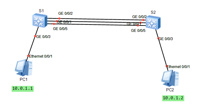 ![]() Goal: To achieve link redundancy and bandwidth overlay through Eth-Trunk, and at the same time, PC1 and PC2 can communicate across switches. 2. Detailed configuration steps 1. Switch S1 configuration <Huawei> system-view [Huawei] sysname S1 # Step 1: Create Eth-Trunk 1 and join the physical interface [S1] interface Eth-Trunk 1 [S1-Eth-Trunk1] port link-type trunk # Configure the link type as Trunk [S1-Eth-Trunk1] port trunk allow-pass vlan all # Allow all VLANs to pass [S1-Eth-Trunk1] quit [S1] interface GigabitEthernet0/0/1 [S1-GigabitEthernet0/0/1] eth-trunk 1 # Add the interface to Eth-Trunk 1 [S1-GigabitEthernet0/0/1] quit [S1] interface GigabitEthernet0/0/2 [S1-GigabitEthernet0/0/2] eth-trunk 1 [S1-GigabitEthernet0/0/2] quit [S1] interface GigabitEthernet0/0/5 [S1-GigabitEthernet0/0/5] eth-trunk 1 [S1-GigabitEthernet0/0/5] quit # Step 2: Configure the access port of PC1 (Access mode) [S1] vlan batch 10 # Create VLAN 10 [S1] interface Ethernet0/0/1 [S1-Ethernet0/0/1] port link-type access [S1-Ethernet0/0/1] port default vlan 10 [S1-Ethernet0/0/1] quit # Step 3: Configure the VLANIF interface (to achieve cross-switch interoperability) [S1] interface Vlanif 10 [S1-Vlanif10] ip address 10.0.1.254 24 # Configure the gateway of VLAN 10 [S1-Vlanif10] quit ---------------------------------------------------- 2. Switch S2 configuration <Huawei> system-view [Huawei] sysname S2 # Step 1: Create Eth-Trunk 1 and join the physical interface [S2] interface Eth-Trunk 1 [S2-Eth-Trunk1] port link-type trunk [S2-Eth-Trunk1] port trunk allow-pass vlan all [S2-Eth-Trunk1] quit [S2] interface GigabitEthernet0/0/1 [S2-GigabitEthernet0/0/1] eth-trunk 1 [S2-GigabitEthernet0/0/1] quit [S2] interface GigabitEthernet0/0/2 [S2-GigabitEthernet0/0/2] eth-trunk 1 [S2-GigabitEthernet0/0/2] quit [S2] interface GigabitEthernet0/0/5 [S2-GigabitEthernet0/0/5] eth-trunk 1 [S2-GigabitEthernet0/0/5] quit # Step 2: Configure the access port of PC2 (Access mode) [S2] vlan batch 10 [S2] interface Ethernet0/0/1 [S2-Ethernet0/0/1] port link-type access [S2-Ethernet0/0/1] port default vlan 10 [S2-Ethernet0/0/1] quit # Step 3: Configure the VLANIF interface (in the same network segment as S1 to achieve intercommunication) [S2] interface Vlanif 10 [S2-Vlanif10] ip address 10.0.1.253 24 # Configure the same network segment IP (optional, if only PC communication is required, the gateway can only be configured with S1) [S2-Vlanif10] quit 3. PC configuration PC1: IP 10.0.1.1, subnet mask 255.255.255.0, gateway 10.0.1.254 (Vlanif10 of S1). PC2: IP 10.0.1.2, subnet mask 255.255.255.0, gateway 10.0.1.254 (Vlanif10 of S1). 4. Verify configuration Eth-Trunk status verification: Run display eth-trunk 1 on S1 or S2 to confirm that the physical interfaces have been added and the status is Up. PC interoperability verification: Execute ping 10.0.1.2 on PC1 and PC2 should be successfully connected. Through the above configuration, the three links between S1 and S2 have been aggregated into Eth-Trunk, achieving link redundancy and bandwidth overlay. At the same time, PC1 and PC2 can communicate across switches. |