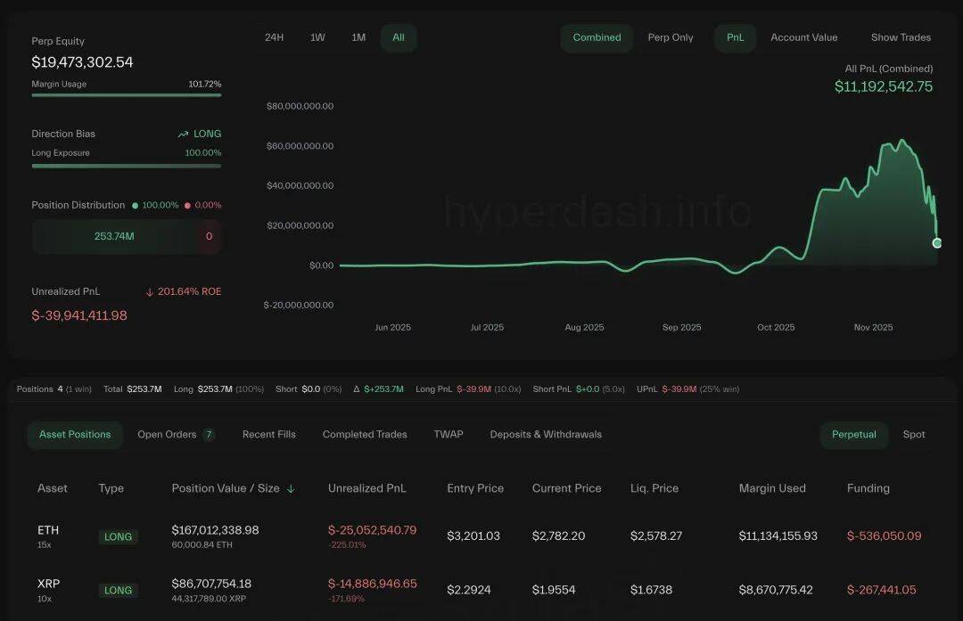 👆Follow me to share Web3 cutting-edge news every day👆Jinqun +Q: 3846328374 Ethereum (ETH) has fallen below core support and is now at multi-month lows. Massive liquidations, surges in selling pressure, and a collapse in confidence have continued to raise market concerns about a new bear market. Bitcoin and mainstream altcoins simultaneously lost key technical areas, and panic spread in the crypto market. 1. Market microcosm: Giant Whale lost 61 million in profits in 10 daysThe well-known trader known as the "anti-CZ whale" has recently suffered a dramatic profit reversal. 10 days ago, he accumulated nearly US$100 million in profits with highly volatile positions on the Hyperliquid platform. However, as the market plummeted, his long positions in ETH and XRP suffered significant losses. ![]() (Data source: Lookonchain) Enter skirt +Q: 3846328374 At present, the giant whale's profit is only 38.4 million US dollars, and more than 61 million US dollars have evaporated in 10 days, and its income has shrunk by more than 60%. This kind of "profit taking" by veteran traders is a true reflection of ETH's current pressure, highlighting the rapid reversal of bullish sentiment after the key support fell. 2. Weekly crisis: $2,650 becomes the last line of defenseThe ETH weekly chart has entered the life and death stage, and the technical signals are all bearish: