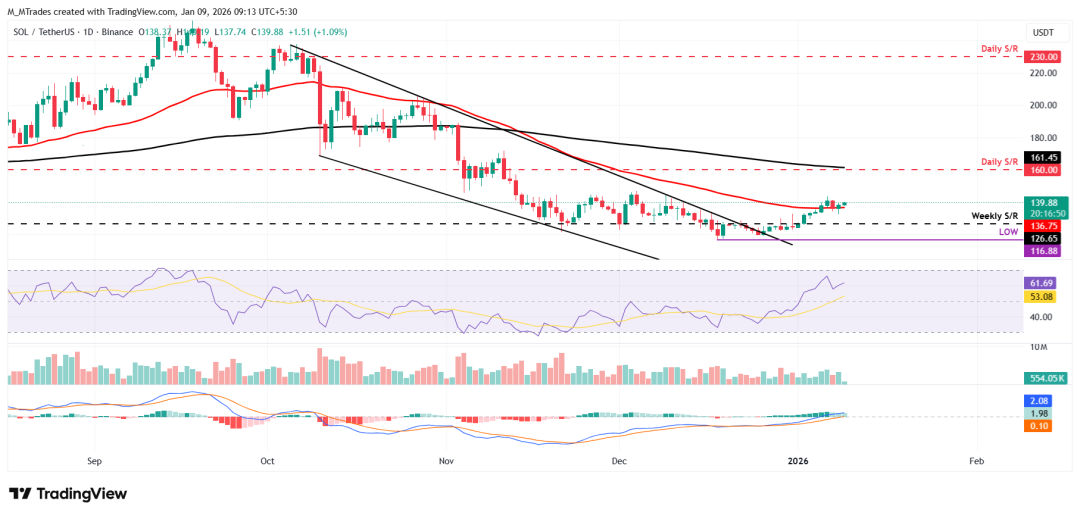 The flight conditions are changing rapidly, and the specific entry and exit positions are determined based on the real-time flight conditions. Just follow the trend if the position is broken! No matter how confident you are, please strictly implement the stop-profit and stop-loss strategy! That’s all for today! Follow me and I will help you penetrate the fog of the currency circle and seize the bull market’s magic coin! Solana (SOL) shares extended their gains, breaking above $140 on Friday after the stock rebounded from key support the previous day. Institutional demand continues to strengthen, with the SOL spot exchange-traded fund (ETF) recording more than $41 million in inflows so far this week. On the technical front, bulls remain in control with price targets above $160. ![]() Institutional demand for Solana continues to strengthenInstitutional demand for Solana remains strong so far this week. SoSoValue data shows that as of Thursday, the Solana spot ETF recorded a weekly net inflow of $41.08 million, setting the highest weekly inflow since mid-December and continuing the weekly net inflow momentum since its launch on October 28. Additionally, total net assets of the Solana ETF have reached $1.1 billion so far this week, indicating continued rising institutional demand. If capital inflows continue and intensify, SOL prices may rise. ![]() Some other signs of optimismOn Wednesday, Morgan Stanley announced that it had filed S-1 registration statements for spot Bitcoin and Solana ETFs with the U.S. Securities and Exchange Commission (SEC), underscoring the growing interest of Wall Street investors. If approved, this would signal a positive long-term future for Solana, as these ETFs would have a positive impact on SOL by allowing investors to gain exposure without directly holding it, while also increasing liquidity, legitimacy, and overall adoption. During the same period, Frontier Stable Token (FRNT) issued by the Wyoming Stable Token Committee, the first stablecoin issued by a U.S. state government, was officially launched on the Solana network, highlighting the institution's growing trust in Solana's infrastructure. ![]() Solana Price Forecast: SOL bounces back after retesting key supportSolana price closed above weekly resistance at $126.65 on January 2 and rose nearly 12% over the next five trading days to end the week at $136.75, above the 50-day exponential moving average (EMA). However, SOL price declined slightly on Tuesday, tested the 50-day EMA again, and rebounded the next day. As of Friday, SOL was trading above $139. If SOL continues to rise, the rally could extend to the next daily resistance at $160. The relative strength index (RSI) on the daily chart is at 61, which is above the neutral level of 50, indicating that bull momentum is building. Furthermore, the Moving Average Convergence/Divergence indicator (MACD) shows a golden cross and the green histogram breaks above the neutral level, further supporting the bullish view. ![]() However, if SOL pulls back, it could continue its decline towards the 50-day moving average near $136.75. The flight conditions are changing rapidly, and the specific entry and exit positions are determined based on the real-time flight conditions. Just follow the trend if the position is broken! No matter how confident you are, please strictly implement the stop-profit and stop-loss strategy! That’s all for today! Follow me and I will help you penetrate the fog of the currency circle and seize the bull market’s magic coin! |
