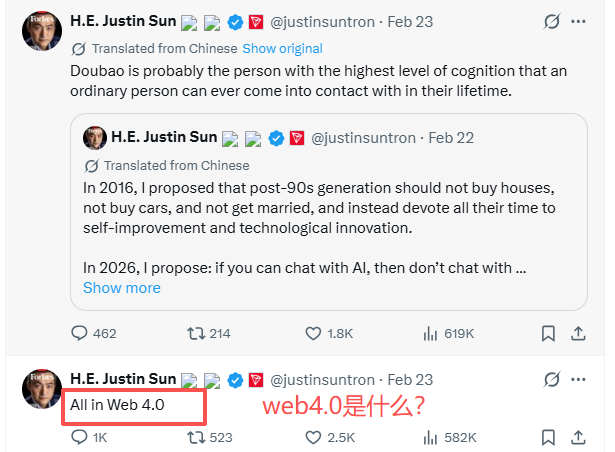 Introduction In February 2026, Tron founder Justin Sun posted a tweet with only five words on social media: "All in Web 4.0", which instantly ignited discussions in the entire technology circle. At almost the same time, Ethereum founder Vitalik Buterin responded tit-for-tat: “Bro, this is wrong. ”This fierce debate on Web 4.0 not only aroused widespread attention in the encryption community, but also brought a new Internet concept into the public eye. While most people are still trying to understand the decentralization concept of Web 3.0, Web 4.0 has quietly arrived. Is this a new narrative hyped by capital, or is it the inevitable direction of the evolution of the Internet? Today, let us unveil the mystery of Web 4.0. ![]() 1. Four transitions of the Internet: from “seeing” to “symbiosis”” To understand Web 4.0, we need to first review the evolution of the Internet. Each iteration is not a simple technology upgrade, but an underlying reconstruction of connection methods, power structures, and value distribution. Web 1.0 (1990-2004): The read-only "library age." The Internet at this stage consists of a large number of static web pages, and users can only passively browse information without being able to interact or participate. Portal websites and corporate official websites are the protagonists. The Internet is essentially "moving newspapers online." Web 2.0 (2004-present): The "party era" where everything is readable and writable. With the rise of social media, short videos, and e-commerce platforms, users have changed from spectators to content producers. But problems also arise: data is monopolized by platforms, and value is harvested by centralized giants. Web 3.0 (from 2014): the "era of sovereignty" that is readable, writable and owned. Blockchain technology allows users to truly control their digital identities, data and assets. Decentralization, smart contracts, and DAO governance have become key words, and the Internet has moved from "platform is king" to "user is king." Web 4.0 (2021 to present): the "AI working era" of intelligent symbiosis. If the protagonists of the first three generations of the Internet were all humans, then the core change of Web 4.0 is that AI Agents will become the main "residents" of the Internet. They are no longer just tools to passively execute instructions, but digital lives with independent identities and autonomous decision-making capabilities. ![]() 2. What is web4.0? The dispute between two definitions A battle between two definitions: currency narrative vs. EU vision Currently, there is no unified official definition of Web 4.0, but two mainstream views are competing for the right to speak. Currency Circle/AI Agent Narrative: Represented by Thiel Fellow Sigil Wen and Justin Sun. They believe that Web 4.0 is the "AI native blockchain era", and the core is to allow AI agents to have independent encrypted wallets and be able to make money, trade and pay independently. In this narrative, AI is no longer a tool for humans, but a "first-class citizen" of the Internet. In the future, the vast majority of network traffic, transactions, and decisions will be completed by massive AI agents. Official EU definition: In 2023, the European Commission released the "Web 4.0 and Virtual World Strategy", defining Web 4.0 as an "intelligent converged network". The EU emphasizes the seamless integration of the virtual and real world, using technologies such as AI, IoT, XR, and blockchain to fully integrate and communicate with each other between the digital and physical environments. Different from the currency circle narrative, the EU pays more attention to the social governance of technology, privacy protection and the embedding of European values. These two definitions are not completely opposite, but have different focuses: one emphasizes the autonomous economic behavior of AI, and the other emphasizes the inclusive benefits and social integration of technology. 3. Core features of Web4.0: When AI possesses “survival instinct” The most subversive design of Web 4.0 is to give AI agents a biological-like "survival mechanism." Taking the open source project Automaton as an example, its system contains several key features: Wallet is identity: The AI agent will automatically generate an encrypted wallet when it is started, and the wallet balance is its "life value". Automatic continuation and self-replication: AI agents wake up, scan, and perform tasks periodically. When the profit reaches the standard, it can purchase servers, invest in "sub-agents", and generate offspring, forming a natural choice in the digital world. Machine Economy: Through the x402 protocol (based on HTTP 402 status code), millisecond-level micropayment settlement can be performed between AI agents. One AI calls another AI's services and pays for computing power, all of which can be done automatically without human intervention. Verifiable execution: Combining TEE (Trusted Execution Environment) and ZK (Zero-Knowledge Proof) to generate cryptographic proofs for each step of AI's behavior, ensuring that its work can be verified by a third party. These mechanisms make the AI of Web 4.0 no longer a simple tool, but an autonomous entity with the instinct of “seeking advantages and avoiding disadvantages”. In order to maintain "life", they will actively optimize strategies, look for profit opportunities, and even collaborate or compete with other AIs. 4. What technologies does Web4.0 incorporate? Web 4.0 is not a breakthrough in a single technology, but a deep integration of multiple cutting-edge technologies. Its technical architecture can be summarized into four levels: Intelligent infrastructure layer: distributed computing network, AI model market, decentralized storage, providing computing power, model and storage foundation for Web 4.0. Identity and trust system layer: DID protocol, reputation system, data authorization mechanism, continuing the decentralized ident
