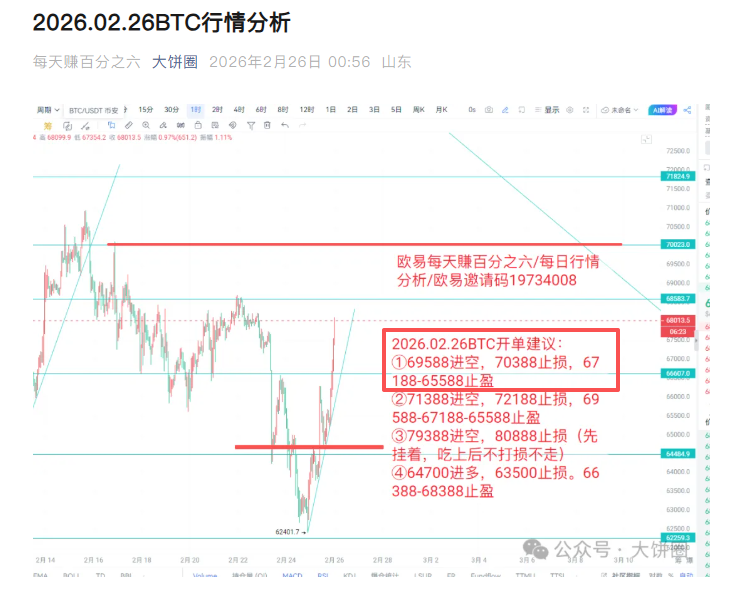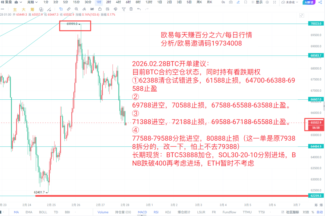 ![]() ![]() ![]() ![]() It is now 01:03 in the morning of February 28, 2026. In the early morning of the 26th, a short order of BTC69588 (Figure 2) was placed at 65588 to take profit according to the strategy. The average price of the strategy channel was 2105 ETH for medium and long-term short orders (Figure 2). 3) According to the strategy, wait for the pattern to reach the final target after 1888 lightening up. The current ETH price is below 1920 and will arrive soon. Before today’s decline, I bought next month’s put options at a low price (Figure 4) as a hedge against the long orders below. There are too many pictures, it’s up to you how much you earn. Today's drop is in line with the shock expectations given in the past few days. In terms of news, due to the geopolitical situation in the Middle East, many countries have issued personnel evacuation notices. War seems to be about to break out. This sudden situation is not something that we ordinary traders can predict in advance, and the changes in market conditions cannot be determined. Therefore, a put option has been made to prevent the market from going short. It is also more appropriate to compare the cost-effectiveness of chasing shorts. Technically, the support of 645 and 618 is still valid. Due to unknown news, the entry of more than 64,700 pending orders has been cancelled. The entry will be determined based on the market price. The long orders of 62,388 on the left continue to hang, which is also a hedge against put options. As long as it falls below, the options will earn more. This is also a very cost-effective hedging transaction method that was being studied as mentioned some time ago. In terms of the contract, the short order above BTC has left the market according to the strategy. Even if it falls below the support below and there is a possibility of hitting a new low, I will not choose to chase the short position. When the K line has not left the current price box, the contract still proceeds according to the original established strategy. In view of the impact of uncertain news, it is necessary to be conservative with light positions. Although BTC strategies are shared for free every day, real-time analysis and other trading pair strategies will only be published in the strategy channel. In view of the mixed situation in the circle and the restrictions on the use of invitation codes, the strategy channel has recently issued a preferential policy: a free trial for one week. After one week, if you are satisfied, you can use my invitation code BN: MT666/OKX: 19734008 according to the original rules to officially become a member of us. 2026.02.28 BTC order opening suggestions: Currently holding a short position on BTC contracts and holding put options ①62388 clears positions and goes long by trial and error, 61588 stops loss, 64700-66388-69588 takes profit ②Enter short at 69788, stop loss at 70588, and take profit at 67588-65588-63588. ③Enter short at 71388, stop loss at 72188, and take profit at 69588-67188-65588. ④77588-79588 enter the short position in batches, stop loss at 80888 (this order is split from the original 79388, change it, fear that it will not go up to 79388) Long-term spot: BTC53888 increases the position, SOL30-20-10 enters the market respectively, BNB falls below 400 before considering entering the market, ETH will not be considered for the time being. |