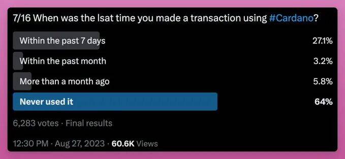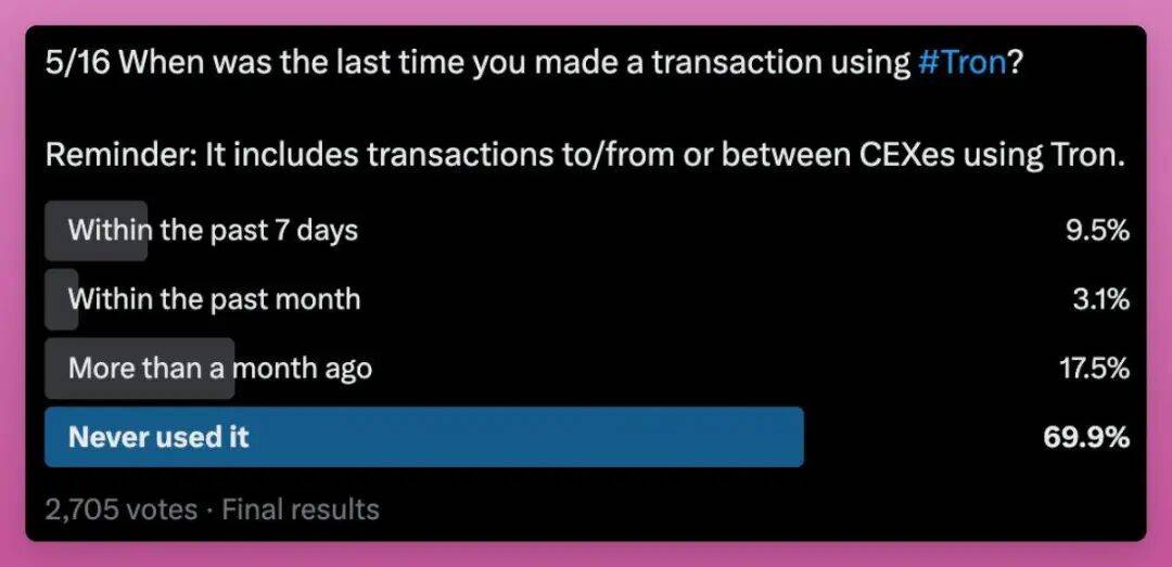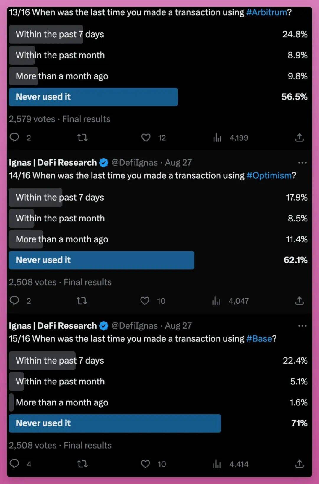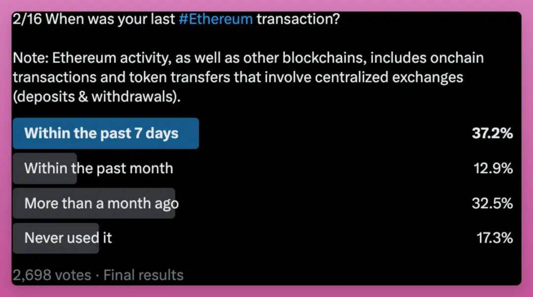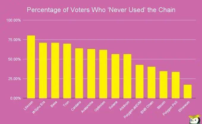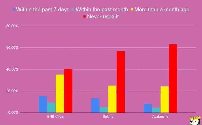 最近有一项关于各大公链及Rollups在实际应用中的调查,以投票的形式开展,主要是在X(推特)平台上开展的,从调查的结果来看虽然以太坊仍然占据主导地位,但它的高手续费对其用户量也产生了一定的影响,另外公链Cardano和Polygon虽然社区比较活跃,但实际的使用率比较低,其次rollups作为一种链上扩容的方案,正受到越来越多用户的关注。 下面我们来看看具体的数据情况。 你从来没用过哪个链?这项投票可以说是公开处刑了,看看哪条链从来没有用过的人多,最高的是莱特币、紧接着是Zksync,然后是base,不过我们再来看有34%的人从未使用Bitcoin主网,而17%的投票者表示从未使用过以太坊主网。 ![]() “从未用过”百分比排行榜 你最近一次交易是什么时候?1.以太坊Ethereum仍是“霸主”,尽管是在熊市,还是有37%的人在最近7天内到以太坊主网上进行了一次交易,此外有17%的人从未使用过,可能是由于高昂的Gas费用而选择了更便宜的网络。![]() 以太坊网络用户调查 2.Cardano 调查显示Cardano社区非常活跃,光这个调查的参与者有6.3K都是Cardano的粉丝,其他区块链大约有2.7K,但投票的结果却人大跌眼镜,一半以上的人表示从没用Cardano,什么鬼,难道为爱发电? 那是肯定不可能的了!据DappRadar数据显示,eth上有4269个Dapp,Polygon上有1792个Dapp,BNB上有4937个Dapp,Cardano上有42个Dapp,是的你没看错,真的只有42个 ![]() ,Cardano发展的速度非常缓慢,据说是专注于做好底层,因此真正能玩的Dapp没几个,所以使用的人很少。 ![]() Cardano 用户调查 3.莱特币 关于莱特币的真实活跃度,过去7天里只有28人使用了Litecoin,超过97.8%的人从未使用过,一个月前使用过有17.3%,但让人匪夷所思的是在DeFiLlama的每日活跃用户排名中,Litecoin排在第五,可能是刷的数据,又或是莱特币的社区不活跃 ![]() ![]() 4.TronTron的投票结果也比较奇怪,根据Defillama的数据,它是每日活跃用户最多的链,但超过70%的投票者表示从未使用过。 ![]() Tron 用户使用情况 据悉Tron更多的作为发展中国家的支付方式,出现这种结果可能是大部分的社区成员不用推特又或是社区不活跃 。 5.Polygon 下面我们来看看Polygon,Polygon的社群很是强大,其Polygon PoS和zkEVM的投票比其他链多出高达50%,注意哦Polygon zkEVM你可以简单的把它理解为升级版Polygon2.0! ![]() Polygon 与 Polygon zkEVM 使用情况 7.BNB 、Solana 、 Avalanche 下面我们直接综合看一下BNB 、Solana 、 Avalanche,在过去的7天里,BNB与Solana和Avalanche相比有更多的用户,40%的投票者从未使用过BNB链,而Solana和Avalanche的却更高,分别是56%和63%。 BNB链是继Ethereum、Polygon PoS和BTC之后,使用最多的链。 ![]() BNB Chain vs Solana vs Avalanche 8.二层Rollup结果显示大部分人更喜欢使用Optimistic Rollups,仅次于Ethereum L1。 在过去7天里,四分之一的受访者使用了Arbitrum,Base和Optimism紧随其后。 ![]() Arbitrum vs Optimism vs Base 总之社区的活跃度是一个积极的信号,但实际的应用情况可能受到多种因素的影响,而且这次的调查只面向X(twitter)平台,可能收集的样本还不够大,在解读调查结果时还是需要综合考虑。 原文:Ignas 编译:koki in cloak 注:部分图片来源于网络,如有侵权请联系删除 本文仅做知识分享,不代表情报处观点,不构成任何投资建议 地址:0xd4E129dB6cf93b2aeB90FD71002B278C79b557a7 ![]() ![]() ![]() ![]() ![]() 关注情报处 ![]() 加入粉丝交流群 |