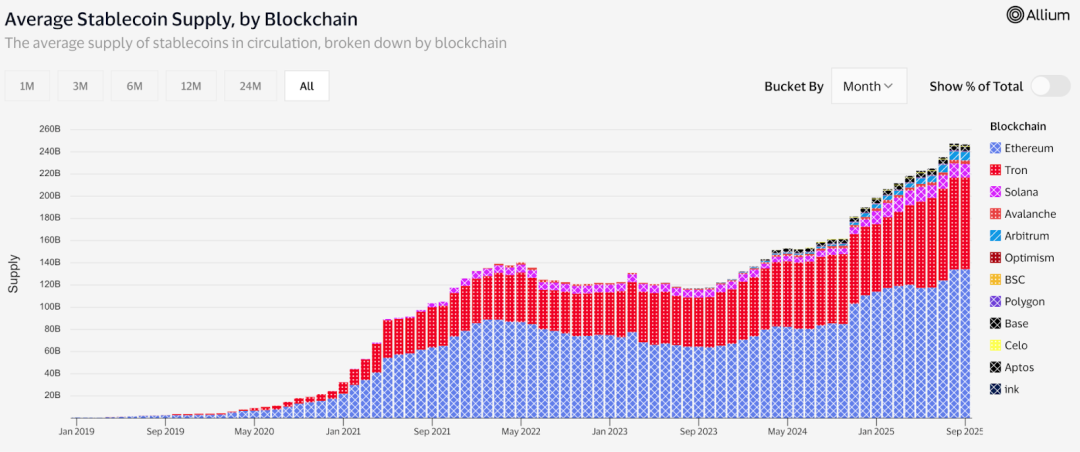 有了前面奠定的技术方案和BTT、稳定币等生态应用落地的基础和DeFi等赛道生态的加持,波场TRON生态全面“开花”,截至发文时,从Tronscan 浏览器提供的数据可以看到:波场TRON网络总账户数已经超过3.3亿、总TVL近300亿美金、百亿级别的交易数量、20万亿级别的总转移金额,过去24小时转账数达到9千万笔、金额达250亿美金。 ![]() 波场TRON链上数据 来源:Tronscan 近年以来,波场TRON聚焦继续扩容以提高吞吐量(>2000 TPS)、更低费用,推进Web3生态,整合AI和去中心化存储,进一步增强波场TRON的竞争力。 目前,波场TRON生态可谓是全面开花,DeFi(含稳定币支付)、NFT、去中心化存储、GameFi、Meme、AI+Web3、跨链互操作等赛道均名列各大公链前茅。 今年初,CryptoRank 发布《TRON H2 2024:主导稳定币生态系统,同时开拓新视野》,对波场 TRON 2024 年下半年的表现给予了高度评价,报告指出波场 TRON 是成本效益最高的 L1 区块链,波场 TRON 凭借近 4 亿活跃地址,成为 2024 年下半年三大最活跃的区块链之一。 ![]() 2024年下半年公链稳定币交互地址数 Top10 2025年上半年:波场TRON链上活动强劲增长,Q2交易量超7.84亿笔;USDT供应量增长41%至812亿;集成AEON Pay、Chainlink、MoonPay等平台;新增Kraken等超级代表;TRX市值增长33.8%。 孙宇晨曾对波场TRON提出“区块链的本质在于去中心化,它应当打破金融壁垒,让技术红利惠及全球”的愿景,这一愿景也贯穿了波场TRON的发展历程。波场TRON今天的成绩,既得益于基金会的引导和社区的凝聚力,也离不开孙宇晨多年来的努力——他亲自参与行业会议,积极推广Web3,并推动波场TRON在亚洲、非洲等新兴市场落地应用。 02 迈向“全球支付与金融基础设施” 截至2025年9月,全球稳定币总市值已超过2800亿美元,交易量高达33万亿美元,接近Visa交易量的3倍。 在稳定币热度持续升温的今天,波场TRON早已成为支付与稳定币领域的龙头,通过真实的应用驱动为背景,TRC-20 转账量和活跃度全球领先,成为跨境支付和稳定币流通的重要网络,今天,它已然交出了一份令人满意的“报告”。 以下图表来自Visa Onchain Analytics,数据显示,2019年到2025年之间波场TRON的稳定币供应量迅速增长且一度占领领先份额,按区块链细分的稳定币市场总供应量始终大幅领先Solana、Avalanche等热门公链。 ![]() 2019-2025稳定币供应(按区块链)来源:Visa Onchain Analytics Goldman Sachs(高盛)称 2025 年是“稳定币之夏”,贝莱德在其多份市场评论中将稳定币视为“未来金融的一个核心力量(mega force)”,强调其正在作为数字支付基础设施崛起。渣打、麦肯锡的报告和分析,不约而同地预测在《Genius Act》与监管明朗的推动下,稳定币供给或将在 2028 年增至 2 万亿美元。 众所周知,稳定币的未来潜力空间上限极高,无数大机构已经开始摩拳擦掌,而波场TRON在稳定币领域已经“事实标准化”,作为2019年就进入超早期布局的选手,正在不断加固其“护城河”,未来料将加大对跨境支付/机构合作的布局。 近期,在波场TRON八周年之际迎来了品牌升级:不仅是形象焕新,更是代表波场TRON要从“领先公链”迈向“全球支付与金融基础设施”的战略升级。成为全球区块链支付的底层基础设施,推动区块链走向主流与大规模应用。 03 小结 从年轻公链起步到成长为全球领先的去中心化网络,波场TRON正式迎来品牌升级的重要时刻。在孙宇晨的战略远见、技术创新、合规探索与行业影响力的推动下,波场TRON已成为区块链和加密行业中具备“金融基建”意义的核心网络之一。在新金融变革的浪潮中,生态完善、基础稳固的波场TRON有望成长为“区块链版的Visa+SWIFT”。 END 上一篇:加密行业"成人礼":SEC开启闸门,华尔街"ETP盛宴"正式开始 推荐阅读 Base发币:一场蓄谋已久的加密“阳谋” 华尔街"聪明钱"大举押注Solana:从ARK到企业财库的全面布局 加密圈痛失最强“带货王”,特朗普盟友查理·柯克校园遇刺身亡 USDD 2.0 正式部署至以太坊,稳定币“黑马”狂撒百万激励 巨鲸悄悄建仓,散户还在观望:山寨币即将爆发? 『声明:本文为作者独立观点,不代表白话区块链立场,本内容仅供广大加密爱好者科普学习和交流,不构成投资意见或建议,请理性看待,树立正确的理念,提高风险意识。文章版权和最终解释权归白话区块链所有。』 喜欢请点「在看」👇 |