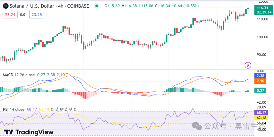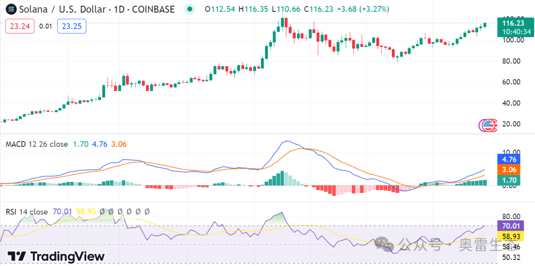 Solana 价格分析表明今天的看涨趋势,多头在过去 24 小时内一直处于控制地位。SOL 交易价格为 115.65 美元,较开盘价 112.12 美元上涨 1.67%。尽管空头已经控制了市场,但他们未能将价格推回到 108.49 美元的支撑位以下。多头现在处于强势地位,因为他们推高了价格,并且市场在这个水平上找到了强有力的支撑。 技术指标显示出强劲的上升趋势,多头乐观地认为这一趋势将在短期内延续。只要买家继续控制市场,价格就可能继续上涨。另一方面,情绪的突然变化可能导致 SOL 价格回调。 Solana价格分析1日图:SOL在过去24小时内飙升1.67%Solana 1 天价格分析显示,价格一直处于上升趋势,自昨天收盘以来价格走势仍保持在 115.65 美元上方。目前的看涨势头可能会在短期内延续,投资者应留意任何逆转迹象,因为突然的看跌走势可能会导致 SOL 价格跌回 108.49 美元大关。 ![]() SOL/USD 1 日价格图,来源:TradingView MACD 和 RSI 指标表明多头完全控制了市场,SOL 价格很有可能进一步上涨。移动趋同与发散(MACD)线已越过零,表明买盘压力增加。 SOL/USD 4 小时价格图表:Sol价格的支撑位为 108.49 美元4小时Solana价格分析还显示,自今天上午以来多头一直控制着市场,价格在该水平找到了强有力的支撑。Solana 的价格在过去 24 小时内出现了令人印象深刻的飙升,技术指标表明这种趋势可能会在短期内延续。多头将价格推高至 115.65 美元上方,并飙升 1.67%。 ![]() SOL/USD 4小时价格图,来源:TradingView 相对强弱指数(RSI)线已经突破60,表明买家已经控制了市场。同样,MACD 指标已突破零,表明 Solana 的价格还有更大的上涨潜力。 对 Solana 有何期待Solana 价格分析对于在不久的将来进一步上涨价格处于有利地位。由于多头牢牢控制住了局面,而且强劲的技术指标也支持了这一观点,英奇可能会在未来几天看到更高的高点。目前阻力位为116.04美元,如果价格成功突破该水平,价格可能会进一步飙升。所有指标都表明 SOL 市场看涨,交易者应密切关注近期任何潜在的价格走势。 关于 Solana 的最新新闻/观点Solana 凭借其第二款智能手机实现了一个重要的里程碑,收到了超过 10 万份预订单,并获得了 4500 万美元的进一步开发资金。这一成功与其第一款支持加密功能的手机形成鲜明对比,后者花了近一年的时间才售出 20,000 部。Solana 联合创始人 Anatoly Yakovenko 强调了这一预订里程碑对于启动第二款设备生产的重要性。充满希望的预购数量预示着 Solana Mobile 的光明未来,使其成为唯一拥有忠实客户群的加密手机制造商。 2024-2033 年 Solana 价格预测Cryptopolitan 的价格预测2024 年初,加密货币的价格有所回升,但最近的事件表明,空头现在控制了价格动态,增长放缓。Solana (SOL) 今天的价值下跌了 3.16%,也受到了这一趋势的影响。 我们的定价预测表明,到 2024 年底,Solana 的最高价格将为 30.78 美元。该代币的价值将上涨并达到 213.69 美元,这是五年来的最高水平。Solana 的未来前景和潜力是光明的。我们预计 Solana 的价值将继续升值,直到 2033 年,其最高价格将达到 855.78 美元。 ![]()