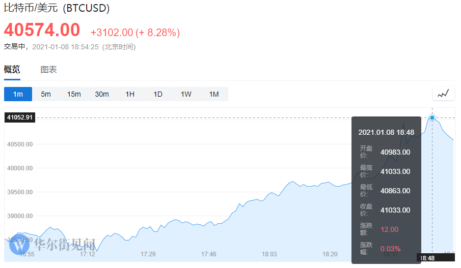 在周四比特币价格突破40000美元后,据Bitstamp,比特币又站上41000美元关口。