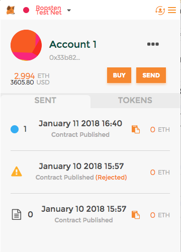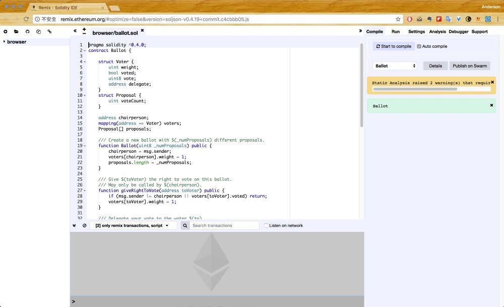 至于一个完整的代币合约,可参考ERC20 Token使用手册。 使用 Remix 编译合约1.点选右上角 + 新增一个档案名称任意只要扩展名是 “.sol”。 ![]() 2.复制合约内容到该档案并编译Remix 预设会自动编译,旁边没有跳出红色的 ERROR 就代表编译成功。 ![]() -编译合约成功- 在本地部署合约1.设定网络点选左边上面的 run。 ![]() -Run- Environment 选择 JavaScript VM 代表所有数据都是存在本地内存(功能类似 testrpc)。它会提供 5 个虚拟账户每个有 100ETH,随便选一个账户(要记住)。 ![]() -Testing Account- 2.发送交易部署合约选择 MyToken。可以看到 create 按钮。且已根据合约内容显示必须填入 initialSupply (也就是要发行的代币数量)。输入一个数目并按 create,就会发送交易部署合约。![]() -Create- 合约部署成功后,可以看到合约的使用接口。Remix 会自动根据合约的内容,产生对应的合约使用接口。可以看到合约有两个功能:balanceOf(查询余额) 和 transfer(转移代币)。 ![]() -合约界面- 底下可以看到 log(纪录每一次的操作)。实际上部署合约是透过一个 Ethereum 交易完成,点 Details 可以看到该笔交易详细数据。 ![]() -Log- 执行合约 — 查询余额1.选择刚刚发起合约的账户![]() -可点选帐户右边的图示复制- 2.输入账户注意要用 “”把帐户包起来,范例: "0xca35b7d915458ef540ade6068dfe2f44e8fa733c" 3.点击 balanceOf可以在旁边看到执行结果,也就是目前这个账户的代币余额。 ![]() -查询余额成功- 错误情况说明一下,因为数据传送是用JSON 格式,所以要加上 “”。如果忘记输入 “” 就会在 log 看到错误: ![]() -JSON 参数格式错误- 执行合约 — 转移代币1.选择要转出的账户选择刚刚发起合约的账户。 ![]() -可点选帐户右边的图示复制- 2.输入要转入的账户选择并复制另一个账户。在合约接口 transfer 后面的字段,输入转入账户和要转移的代币数量。帐户同样用“” 包起来,范例: "0x4b0897b0513fdc7c541b6d9d7e929c4e5364d2db",10 3.点击 transfer点击 transfer,成功后会看到 log 更新。 ![]() -交易执行成功 log- 4.确认余额更新再查询转入账户的余额,就可以看到代币余额增加啦! ![]() -转入账户余额增加- 错误情况如果选择要转出的账户代币余额不足,这笔交易会失败,就会在 log 看到错误。 ![]() -交易执行失败 log- 在测试网络部署合约1.安装 MetaMask首先,要连到测试网络,就要安装 MetaMask。他是浏览器端的 Ethereum 钱包,可以链接 Ethereum 主要和测试网络。安奘后需要建立 Ethereum 账户,教练,我”只”想学Solidity 这篇有详细的步骤。 ![]() -MetaMask- ![]() -成功开启后,应该会长这样- ![]() -记得选择 RopstenTest Net- 2.选择测试网络回到 Remix,这次 Environment 选择 Injected Web3,Remix 会自动连结 MetaMask。 ![]() -成功会看到和MetaMask 相同账户和 Ether 余额- 3.部署合约接着用刚才同样的方式,按create 部署合约,就会看到MetaMask 的弹出窗口。直接按submit 发送交易。 ![]() -用 MetaMask 发送交易- 稍等一点时间(因为要等这个交易被确认),部署成功后合约的使用接口就会跑出来。 ![]() -合约接口,当然是长一样- 就可以用同样的方式使用合约啦! 总结Remix 提供一个 Solidity 智能合约的开发环境,可以简易的编译、部署、执行甚至除错,适合编程经验不多的初学者。但无法做到版本控制、测试及和其他开发工具一起使用等,实际要开发 DApp 的话会比较不方便。下一篇会参考以下文章: