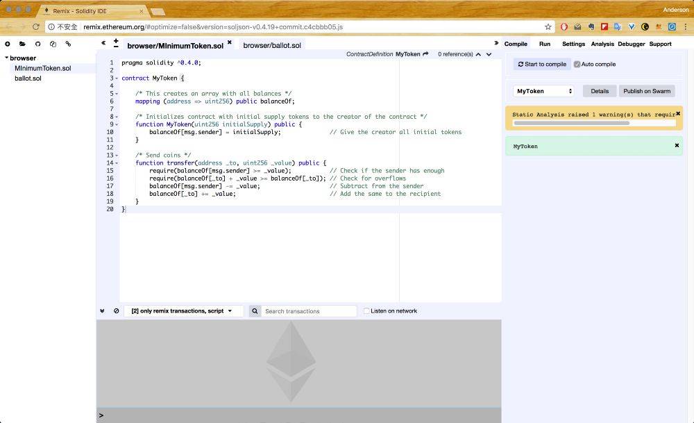 实战 | 教练,我“只”想学Solidity这篇也是用 Remix 和 MetaMask 部署合约到测试网络,已经了解这篇应该可以直接 end。本篇是较详细描述使用 Remix 的步骤及使用上可能碰到的问题。 开发环境不需要安装,直接在任何浏览器开启 Remix。 Remix 是一个 Open Source 的 Solidity 智能合约开发环境,提供基本的编译、部署至本地或测试网络、执行合约等功能。Solidity 是 Ethereum 官方设计和支持的程序语言,专门用于编写智能合约。 ![]() -Remix- 取得代币合约代币合约的范例很多,Ethereum官网有提供一个最小可行的代币合约(MINIMUM VIABLE TOKEN): pragma solidity ^0.4.0;contract MyToken {/* This creates an array with all balances */ mapping (address => uint256) public balanceOf; /* Initializes contract with initial supply tokens to the creator of the contract */ function MyToken(uint256 initialSupply) public { balanceOf[msg.sender] = initialSupply; // Give the creator all initial tokens } /* Send coins */ function transfer(address _to, uint256 _value) public { require(balanceOf[msg.sender] >= _value); // Check if the sender has enough require(balanceOf[_to] + _value >= balanceOf[_to]); // Check for overflows balanceOf[msg.sender] -= _value; // Subtract from the sender balanceOf[_to] += _value; // Add the same to the recipient }} 这个 MyToken 合约真的很傻,只能做两件事: