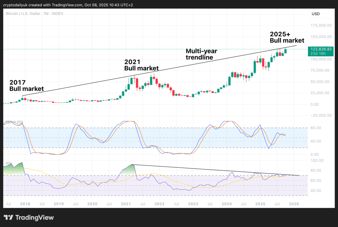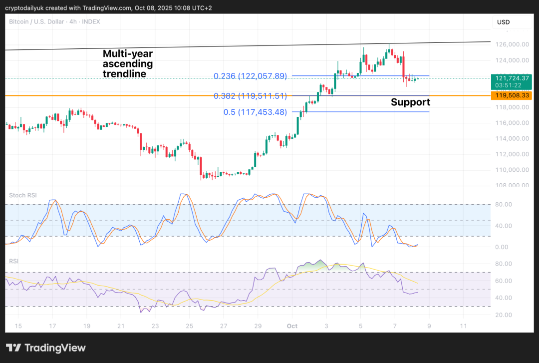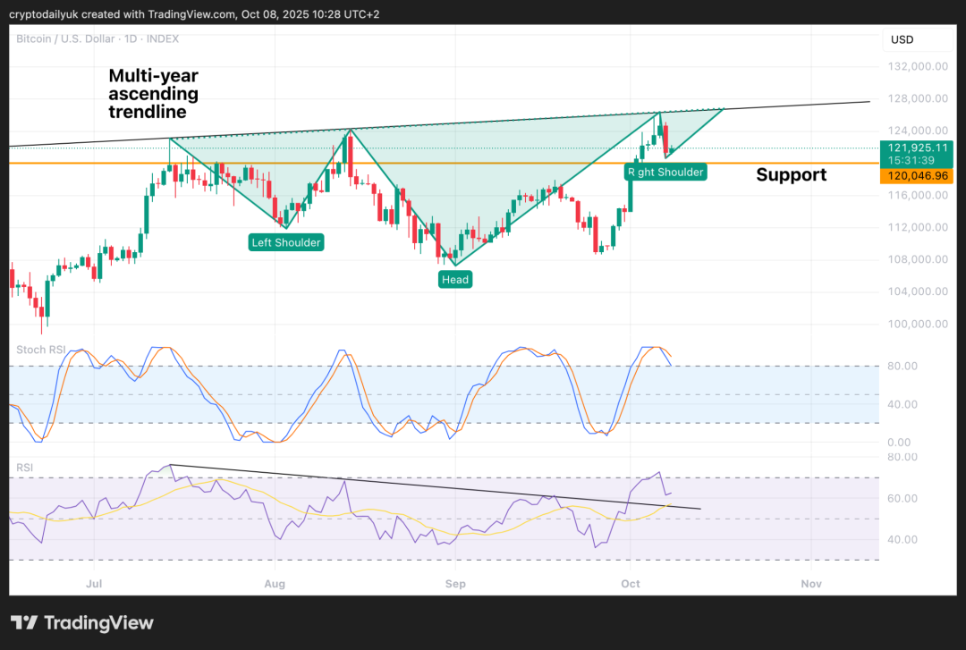 在周一创下历史新高后,比特币价格已脱离多年趋势线。自顶峰以来已下跌 5,500 美元,但跌幅仍然很小。接下来还会有更多上涨吗?还是比特币多头已经准备好将 BTC 推高至价格发现阶段?进一步下跌,还是从这里回到高点?![]() BTC的 4 小时时间框架显示,迄今为止,这是一个非常浅的下跌。根据斐波那契扩展线(蓝色),价格刚刚跌破 0.236 斐波那契水平,这是第一个斐波那契扩展线。如果价格从这里回升至顶部,则将极具看涨潜力。 话虽如此,更深的反转才是更健康的,并且通常会导致更持久的上行价格走势。因此,如果价格继续下跌,至少跌至0.382斐波那契水平(该水平与良好的支撑位相吻合),甚至跌至0.5斐波那契水平,那么下一个波动高点可能蕴含更大的力量和动能。 尽管如此,价格走势依然如此,如果从现在开始上涨,那就顺其自然吧。随机RSI指标显示将从现在开始上涨,图表底部的RSI可能即将开始上涨。这些都表明,这可能是一个底部,并且$BTC价格可能会回升至多年趋势线,并有望创下历史新高。 倒头肩形态继续形成![]() 正如周二文章首次提出的那样,多年来的上升趋势线下方可能正在形成一个倒头肩形态。右肩可能已经回落到足够远的水平,或者价格可能还会进一步下跌,甚至跌至12万美元的水平支撑位。 图表底部的RSI指标线仍位于下降趋势线上方。如果RSI指标进一步下行,则可能意味着价格略微下跌触及水平支撑位。即便如此,即使价格从此处横盘整理并上涨,也足以形成右肩。 正如昨天的文章所述,这一有节制的举动将使$BTC 价格升至145,000 美元左右。 八年的趋势线即将被打破吗?![]() 每月的时间框架可以真实地鸟瞰多年趋势线,该趋势线始于 2017 年牛市的顶部,在 2021 年牛市的第一个顶部被触及,并且在本轮牛市中已经经过了三次测试。许多指标表明,当前的牛市还远未达到顶峰,也许这条持续了 8 年的趋势线最终将被打破,而当这一长期障碍被打破时,随之而来的上行价格势头可能会非常巨大。 随机RSI指标和该高位时间框架内的RSI指标均呈现看跌背离。首先,随机RSI指标需要像在周线和两周时间框架内那样重新上行。其次,RSI指标线需要突破下降趋势线,而目前RSI指标线正位于下降趋势线上方。如果这两个事件同时发生,则很可能与$BTC价格突破8年趋势线同时发生。随后可能会出现惊人的价格水平。 如果你想把握住本轮加密市场,现学现卖肯定是来不及了,最好有人能带你快速入门。扫下方二维码带你加入跟单学习群!!! (若下方二维码添加不了请到公众号里获取最新二维码) ![]() 【免责声明】市场有风险,投资需谨慎。本文不构成投资建议,使用者应考虑本文的任何意见、观点或结论是否符合其特定状况。据此投资,责任自负。 ![]() 实时跟上策略,来!!! |