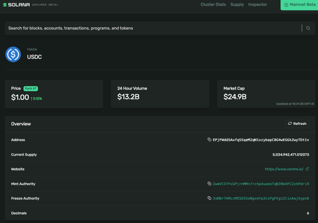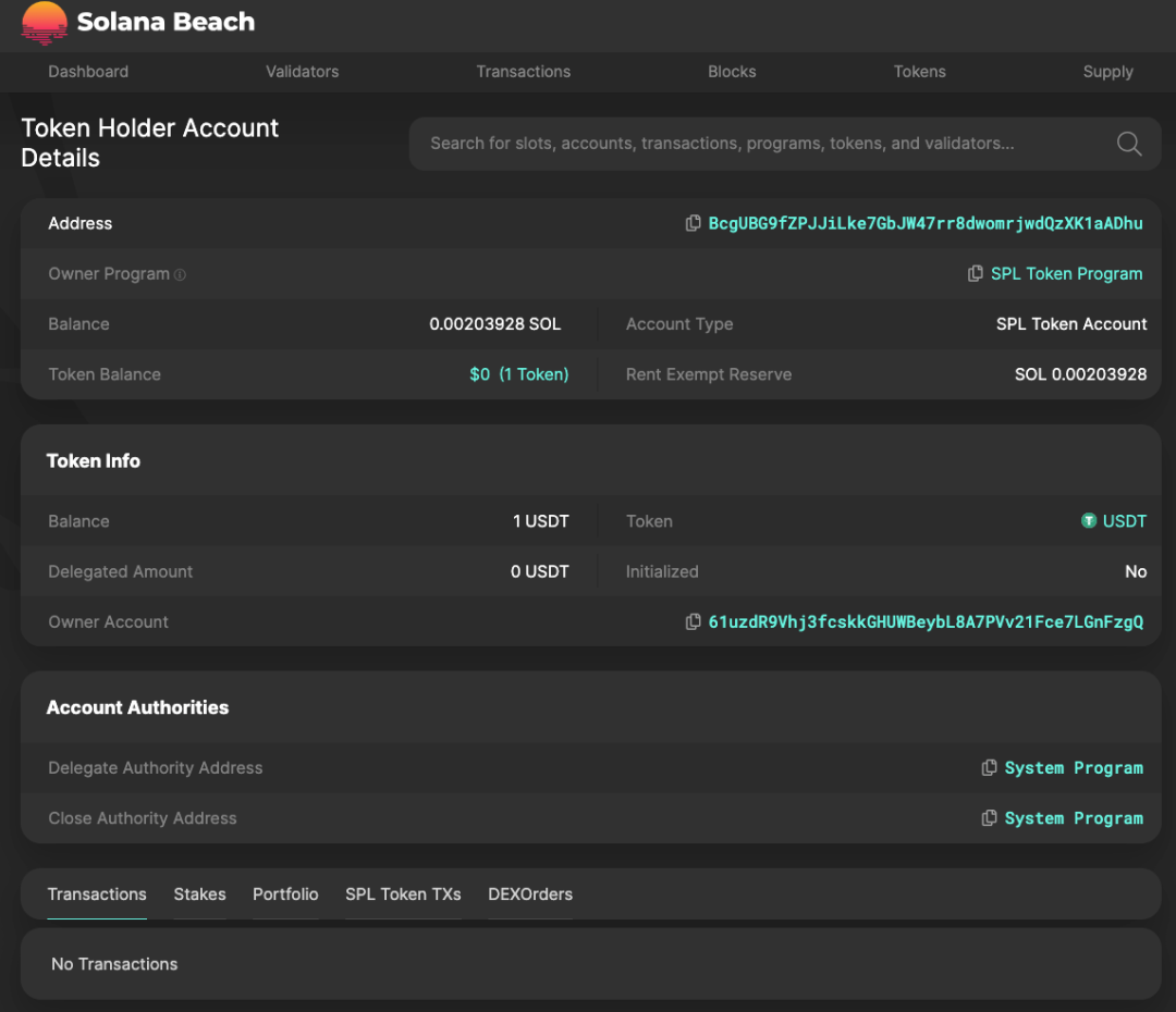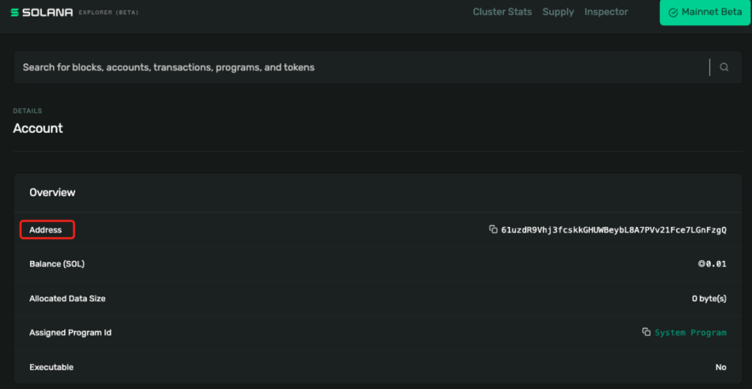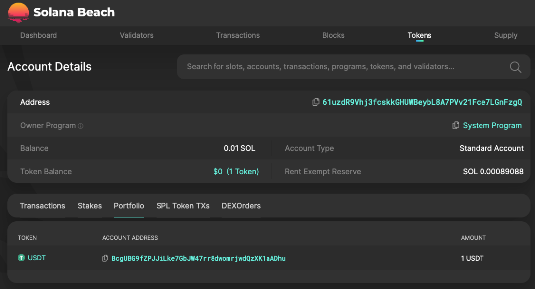 每个账户都有一个地址(一般情况下是一个公钥)以及一个所有者(程序账户的地址)。前者与以太坊上的类似,后者可以简单理解为创建该账户的程序。 普通用户通过钱包生成的账户属于数据账户中的系统所有账户,默认的账户所有者是系统程序。我们可以简单理解为:用户通过系统程序生成了一个系统所有账户,这个账户存储了用户的基本信息和资产等数据,而这个账户拥有一个地址(也就是公钥)。 以 Solana Explorer 为例,普通用户使用的账户,即系统所有账户,在浏览器上的展示如下图: ![]() Assigned Program Id 代表账户的所有者,Allocated Data Size 表示账户已存储的数据大小,Executable 表示账户是否可执行,通常只有程序账户是可执行的。普通用户只需关注账户的地址。 通过以上内容,我们已经对 Solana 账户有了初步的了解,接下来我们来认识下 Solana Token。 Solana TokenSPL-Token 代表 Solana 网络上的所有非本地代币,包括同质代币和非同质代币(NFT)。 ![]() 与 ERC20 和 ERC721 代币类似,SPL 代币 在 Solana 上发行和交易,而其与以太坊的区别是: ![]() 接下来,让我们了解一下什么是 token-account。 在 Solana 上,每个 Token 持有者都有一个特定的 token-account,记录了该持有者特定 Token 的余额和相关信息。例如,Alice 同时拥有 USDT 和 USDC 两种 Token,她将分别拥有两个 token-account,其中一个记录 USDT 的余额,另一个记录 USDC 的余额。 那么如何查看自己的 token-account 呢? 我们可以使用 Solana Beach 浏览器,通过输入数据账户的地址,点击 Portfolio,就可以清晰地看到每个 token-account,每个账户记录着特定 Token 的余额。 ![]() 通过 Solana Beach 浏览器,还能查看每个账户记录的 Token 信息,授权情况等详细信息。 ![]() Solana 交易在 Solana 上,每笔交易都包含以下关键信息: