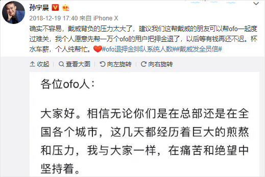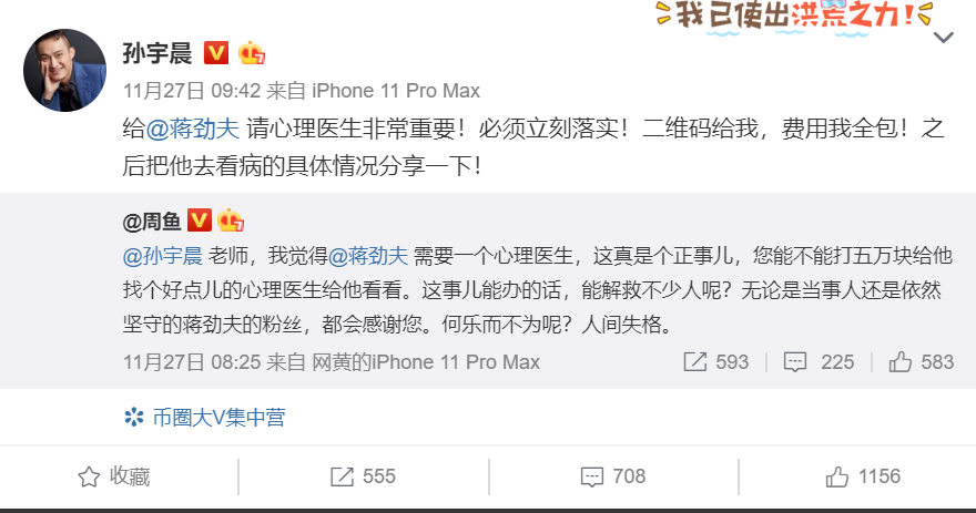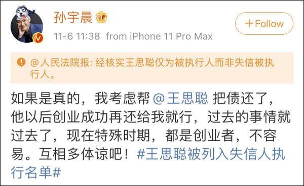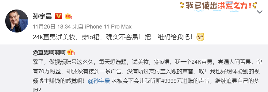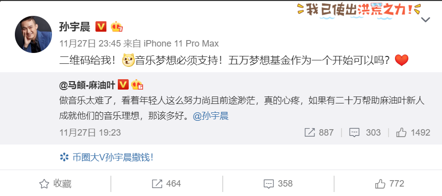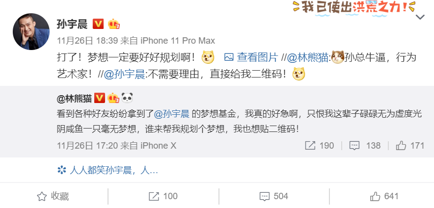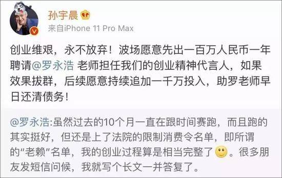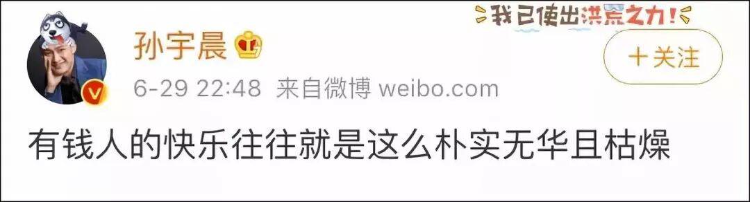 ![]() 孙宇晨好像突然就横空出世跑了出来,然后各种刷新人们的三观。 不断的博眼球之后,终于成为一代恶俗网红,成功的吸引了我们的注意力。 今天就来扒一扒这个孙宇晨。 1 巴菲特的午餐 大家对他的第一次印象是在拍下了巴菲特的午餐。他以创纪录的460万美元,获得了第20届巴菲特慈善午餐。 ![]() 当然了这个也不稀奇,这些年在世界上中国人的表现都是人傻钱多,巴菲特的午餐已经被中国人拍下了 N 多次。但无疑孙宇晨是最特殊的一个。接下来的动作就很骚了。因为仅仅拍下巴菲特的午餐太普通了,太不能够满足他想成为网红的野心。7月23日,在距离巴菲特午餐原定时间不到三天的时候,今年的午餐取消了!孙宇晨在个人微博上表示:“本人因突发肾结石正于医院治疗,因故取消与巴菲特先生的午餐会面”。 孙宇晨以破纪录的456.7888万美元价格拍下巴菲特的午餐,然后再放了巴菲特的鸽子,这个动作确实是前无古人后无来者。 2 孙宇晨的表演 其实在拍下巴菲特午餐之前他就已经开始了一些小动作。 孙宇晨的第一个“大项目”就是ofo小黄车退押金,这个热点挑选得真好, ofo可是亿级别的用户。2018年底,ofo 押金危机已经接近无解,排队人数达到8位数。孙宇晨就像盖世英雄一样,踩着七彩祥云到来了。12月19日下午,孙宇晨在微博上出手了,表示要帮朋友戴威给1万个ofo用户退押金:“杯水车薪,纯个人帮忙。” ![]() 随后,他在关怀民生之路上越走越远。今年2月,热心人士赵宇在楼上听见楼下有人吵架,看到有一个男人在欺负女孩,于是就和那个男人干了一架,后经法医鉴定,把对方打得腹部横结肠破裂,随后对赵宇刑事拘留。孙宇晨大手一挥,要出资一千万对其进行补偿。可能是这两次在微博不温不火,所以接下来就到了文章的开头,孙宇晨人生最高光时刻,拍下巴菲特的午餐,然后再放巴菲特的鸽子。 ![]() 网上还传出孙宇晨的聊天记录,不吃饭会比吃饭更有利,为什么还要去吃饭。这个套路果然算得精准,孙宇晨因这在微博热点上挂了几天。 然而在成名作”晃点巴菲特午餐“之后,孙宇晨的后续各种骚操作才是真正迷了众人的眼。 3 维权和互怼齐上阵 帮小鹏汽车的车主维权7月10日,小鹏汽车发布了2020款G3车型。由于新款车型的续航高于老款,但价格又比老款低,有些消费者认为受到了欺诈。随后的13日,北京广州等地的小鹏汽车城市服务中心外,有大批车主拉横幅,横幅上写“小鹏汽车欺诈消费者,侵犯消费者合法权益”等字样。随后孙宇晨喊话,小鹏汽车大家随便告,我先出1000万保证金。 ![]() 紧接着又和搜索王小川在微博上开始撕X。孙宇晨自曝被王小川怒怼为“骗子”,但这句话随即变成了“刻骨铭心”的“鞭策”。 ![]() 后续王小川发布了一条关于如何定义“成功和骗子”的微博,疑似做出回应。 ![]() 孙宇晨随即再度更帖,向王小川发起一场“三年之约” ,王小川再无回应。 2019年必定是一个不太平的年份,很多曾经在网上非常非常火热的人物,在这一年都纷纷翻了车,这给孙宇晨又制造了绝佳的机会。 4 罗永浩成为老赖 2019年11月4号,罗永浩在自己的公众号中写下《一个“老赖”CEO的自白》,讲述了自己成为“老赖”CEO 的经过,文章中一如既往的充满了情怀和感动。罗永浩指出,按照现代公司法的基本原则,有限责任公司因经营困难、资不抵债时,申请破产清算,然后重新创业会轻松很多,事实上多数连环创业者都是这么做的,但他不想这样做,否则会让很多债权方、投资者彻底失去希望。这篇文章流传非常广泛,很多网友纷纷留言支持老罗,这其中孙宇晨当然不会缺席。 ![]() 5 王思聪被限制消费 ![]() 罗永浩事件过后仅仅 3 天,王思聪被曝出限制消费。11月9日,从中国执行信息公开网获悉,有着国民老公、娱乐圈纪委之称的王思聪,被上海市嘉定区人民法院限制高消费,不得乘坐飞机、软卧、高铁。不知道坐私人飞机的王思聪会受多大影响。王思聪此次被限制高消费,是因为上海熊猫互娱文化有限公司(下称“熊猫互娱”)被旗下男主播曹悦起诉索赔。曹悦被熊猫互娱挖角后,遭原公司索赔。曹悦认为,根据协议,应当由熊猫互娱代赔,但熊猫互娱未出钱。因此,曹悦将熊猫互娱告上法庭。最终法院判定赔偿369.99万元,王思聪作为董事长,被限制高消费。当然我们一直都想不通,作为前首富的王健林为什么没有拉儿子一把,但我们也都知道王公子肯定不差这369.99万元。但孙宇晨觉得王公子可能差这点钱,于是又贴心的站了出来。 ![]() 6 网易裁员事件消费 2019年真是多事之秋,很快就来到了特别热门的网易暴力裁员事件。2019年11月24号,互联网上广泛流传着一篇网名为“你的游戏我的心”的网易前员工控诉网易游戏采用各种手段逼迫他离职的文章,这篇文章写得很出彩并且事实惊人。一个人们印象中高大上的互联网公司竟然会发生这样的事情,于是网上的舆论彻底被引爆了,各界人士纷纷为此员工声讨。这次比较奇怪的是,孙宇晨竟然迟到了,于是冯大辉在微博上@孙宇晨,孙宇晨立刻反应了过来,表示愿意付看病的所有费用。 ![]() 当然经过这两天的发展,我们突然觉得网易公司还不错,至少真正的帮当事人解决了问题。 H 公司才是最让人寒心的,所作所为让人"触目惊心"! 当然这不是本文需要探讨的重点,接下来继续说孙宇晨。 7 谁还有梦想?二维码给我! 只要你有梦想,就给你打 5 