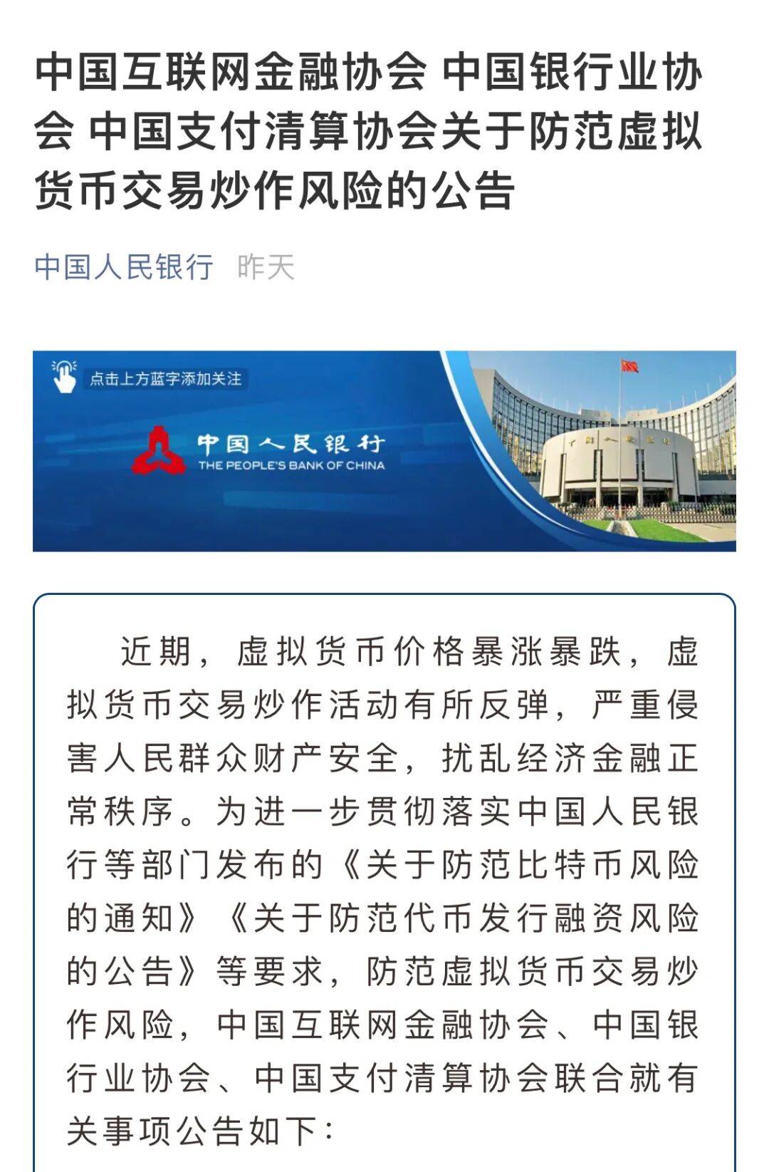 ![]() 近期,比特币、狗狗币等虚拟货币暴涨暴跌,虚拟货币新骗局也频频曝光。 5月18日,中国互联网金融协会、中国银行业协会、中国支付清算协会发布《关于防范虚拟货币交易炒作风险的公告》,要求金融机构、支付机构不得开展与虚拟货币相关的业务。公告提示,虚拟货币交易合同不受法律保护,消费者要增强风险意识,不参与虚拟货币交易炒作活动,要珍惜个人银行账户,不用于虚拟货币账户充值和提现、购买和销售相关交易充值码以及划转相关交易资金等活动。 ![]() 据了解,我国对虚拟货币的监管从2012年就已经开始。 2012年,人民银行等五部委曾发布《关于防范比特币风险的通知》,要求各金融机构和支付机构不得开展与比特币相关的业务。与此同时,人民银行在对《通知》的解释中提到“比特币交易作为一种互联网上的商品买卖行为,普通民众在自担风险的前提下拥有参与的自由”。 2017年,人民银行等七部门发布《关于防范代币发行融资风险的公告》,规定任何所谓的代币融资交易平台不得从事法定货币与代币、“虚拟货币”相互之间的兑换业务,不得买卖或作为中央对手方买卖代币或“虚拟货币”,不得为代币或“虚拟货币”提供定价、信息中介等服务。 本次三协会出台的《关于防范虚拟货币交易炒作风险的公告》,在以往文件的基础上,增加了对消费者群体的要求,呼吁消费者不参与虚拟货币交易炒作活动。 以下为公告全文 ↓↓ 近期,虚拟货币价格暴涨暴跌,虚拟货币交易炒作活动有所反弹,严重侵害人民群众财产安全,扰乱经济金融正常秩序。为进一步贯彻落实中国人民银行等部门发布的《关于防范比特币风险的通知》《关于防范代币发行融资风险的公告》等要求,防范虚拟货币交易炒作风险,中国互联网金融协会、中国银行业协会、中国支付清算协会联合就有关事项公告如下: 一、正确认识虚拟货币及相关业务活动的本质属性虚拟货币是一种特定的虚拟商品,不由货币当局发行,不具有法偿性与强制性等货币属性,不是真正的货币,不应且不能作为货币在市场上流通使用。开展法定货币与虚拟货币兑换及虚拟货币之间的兑换业务、作为中央对手方买卖虚拟货币、为虚拟货币交易提供信息中介和定价服务、代币发行融资以及虚拟货币衍生品交易等相关交易活动,违反有关法律法规,并涉嫌非法集资、非法发行证券、非法发售代币票券等犯罪活动。 二、有关机构不得开展与虚拟货币相关的业务金融机构、支付机构等会员单位要切实增强社会责任,不得用虚拟货币为产品和服务定价,不得承保与虚拟货币相关的保险业务或将虚拟货币纳入保险责任范围,不得直接或间接为客户提供其他与虚拟货币相关的服务,包括但不限于: