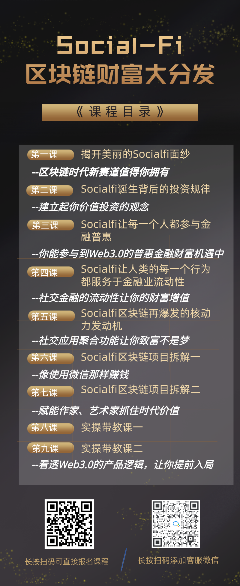 购买课程请扫码客服微信咨询 ☟![]() Social-Fi课程介绍 ![]() ![]() 一、《为赚钱而学习》社群 推荐指数:⭐ ⭐ ⭐ ⭐ ⭐ 产品形式:微信群 产品特点:浸泡式学习,沟通及时,有800多名来自全球各地的华人区块链和数字货币爱好者! 产品功能:随时提问区块链和数字货币相关知识,并获得解答 拆解有价值的区块链和数字货币项目 与700多名来自全球的华人群友一起学习,建立扎实和广泛又有深度的区块链数字货币知识 破解一个人学习时,因为精力有限和经验不足形成的知识盲点 避开投资陷阱和假区块链项目,识别有价值的区块链项目 结识全球华人区块链人脉资源 过往的社群问答精华都被存放于专用软件“知识星球”,随时回看学习 建立扎实的区块链和数字货币认知体系,实现“投资获利是认知的变现” 2022年VIP付费社群服务升级! 新增:投资研判 新增:行情、赛道分析 新增:提供专业的资讯分享和分析服务 解锁【链圈资治通鉴】知识星球过往所有问答记录、项目讲解分析! ![]() 二、《听得懂用得上的区块链实战课》基础课程 产品形式:基于小鹅通软件的音频课程 推荐指数:⭐ ⭐ ⭐ ⭐ ⭐ 产品特点:一次购买,随时使用,“音频讲解+课后辅导+实操讲解”三重学习 产品功能:几十节音频课程搭配课后辅导,帮助您系统认知区块链和数字货币,扎实入门区块链新时代机遇,为未来持续不断的把握区块链和数字货币机遇打下牢固基石。 必学理由:区块链和数字货币是一次时代机遇,蕴藏着超级财富机遇,但时代机遇不是人,没有办法和它攀关系,唯有通过学习了解并把握!那么,首先需要通过基础课入门。 ![]() 三、《区块链时代的基础设施—Defi的讲解课程》 推荐指数:⭐ ⭐ ⭐ ⭐ ⭐ 产品形式:基于小鹅通软件的音频课程 产品特点:一次购买,随时使用,“音频讲解+课后辅导+实操讲解”三重学习 产品功能:理论加实操掌握区块链时代的基础设施——Defi了解Defi里的优质项目并上手实操参与 必学理由:任何一个时代,任何一个国家,都有自己的基础设施建设过程,这个过程蕴藏着超级财富机遇,比如,中国的基础设施建设很多,公路就是其中之一,如果有机会参与一条公路建设,势必获得超级回报,而区块链是一次人类发展史上的时代机遇,在区块链的基础设施—Defi领域,有很多优质的区块链项目和应用,值的学习和参与 四、《数字货币之新机遇—NFT》 推荐指数:⭐ ⭐ ⭐ ⭐ ⭐ 数字货币新机遇 NFT课程介绍: ![]() ![]() ![]() 学 员 好 评 图 ![]() ![]() ![]() 点击左下角“阅读原文”即可进入直播间 |