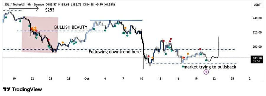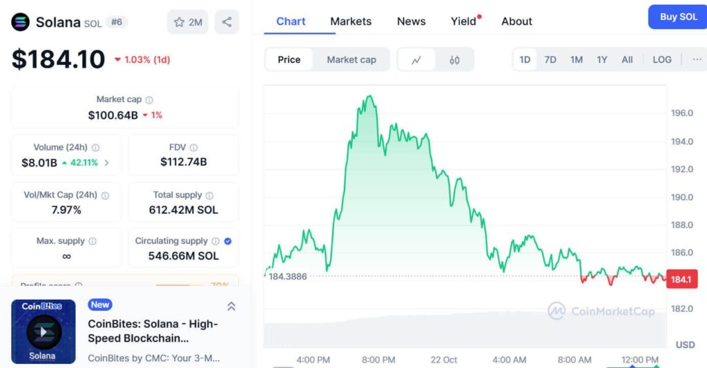Market Overview The current price of Solana (SOL) is stable near $184, relying on the solid support level of $182, showing strong resilience. In the past 24 hours, trading volume surged 42.11% to $8.01 billion, with a market capitalization of approximately $100.64 billion. ![]() Despite a slight intraday decline of 1.03%, the price maintained low volatility in the range of $182-185, and the consolidation pattern continued to tighten, indicating that a significant rise may occur in the short term, with the target pointing to $240-250. Price Trend and Technical Analysis After Solana recently pulled back from a high of $253, it entered a horizontal channel between $182 and $200. $182 became a key bottom support and successfully resisted selling pressure many times. The price is currently consolidating near $184, with resistance near $200 and $240. The daily chart shows that the Bollinger Bands continue to narrow, indicating a decrease in volatility, a pattern that often indicates an imminent directional breakout in the cryptocurrency market. The trading volume soared to US$8.01 billion, an increase of 42% from the previous value, and the price did not fall accordingly, suggesting that institutional funds are actively attracting funds. The fully diluted valuation reached US$112.74 billion, and the trading volume/market capitalization ratio was 7.97%, reflecting the stable dynamics of market transactions, with buyers and sellers competing within a predictable range. Historical data shows that Solana usually rebounds by 30%-50% after a similar consolidation period, and the current pattern supports bullish expectations. ![]() The significance of the $182 support level The $182 support level has been tested many times during the recent pullback, showing strong defensive capabilities. On-chain data shows that the Solana ecosystem has stable capital inflows, continued network growth, and the advantages of fast transaction speed and low fees, attracting more developers and users. The surge in trading volume and the divergence of sideways prices suggest that institutional investors may be preparing for a breakout. Analysts pointed out that if the $182 support level continues to hold, a break above $200 will confirm the bullish trend and push the price towards $240-250. BitGuru commented: “Solana holds on to support at $182. With rising trading volume, it is expected to easily retest the $240-250 area after a breakthrough. ”The narrowing of the Bollinger Bands on the daily chart further proves that the volatility expansion is coming. If the trading volume continues to exceed 8 billion US dollars, it will provide momentum for the rise. Key takeaways