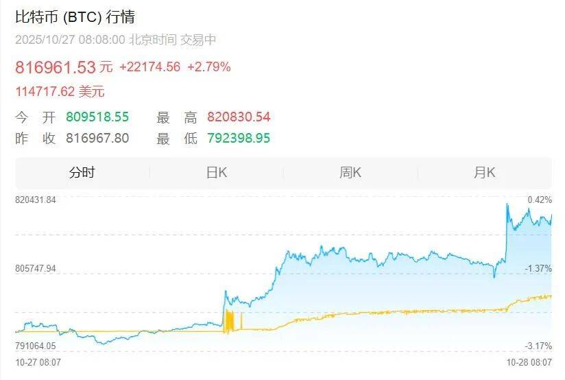 Dear friends in the currency circle, good morning! In a new day, Bitcoin once again breaks into our field of vision with a strong posture. After experiencing shock and consolidation in the past few days, BTC launched an upward attack this morning and successfully broke through the key integer mark. The RMB denominated price reached the 810,000 yuan mark, showing strong upward momentum. Is this rise the beginning of a new round of market trends, or is it a short-term rise and fall? Let us combine real-time data to bring you the latest market interpretation. ![]() 📊 Bitcoin (BTC) real-time quotes Data update time: 08:08, October 27, 2025 (Beijing time) Transaction status: Transaction in progress Core price data (RMB CNY) Current price: ¥816.961.53 24-hour increase: +¥22.174.56 (+2.79%) Core price data (USD) Current price: $114.717.62 key indicators Open today: ¥809.518.55 Yesterday: ¥816.967.80 Maximum: ¥820.830.54 Minimum: ¥792.398.95 📈 In-depth analysis of the disk From the above data we can capture several key signals: Strong rise, breaking through the previous high: The current price not only far exceeds yesterday's opening price, but also breaks through yesterday's closing price, leading the way with a significant increase of more than 2.79%. The market buying power is very active. The amplitude narrowed and the momentum was strong: Although the intraday low fell to around 792,000 yuan, the price was quickly pulled back and hit a new intraday high of more than 820,000 yuan. This indicates that the support below is very solid and every pullback is viewed as a buying opportunity. Pay attention to the key resistance level: currently 820,000 yuan (approximately 821,000 yuan) has become the immediate upper resistance level. If it can effectively establish and break out of this position, it will open up space for Bitcoin to reach higher prices. The primary support level below can refer to yesterday's closing price of around 817,000 yuan. 💡 Investor perspective This rise once again confirms Bitcoin’s “ballast” status among digital assets. In the context of continued uncertainty in the macro environment, Bitcoin's scarcity and value storage function continue to attract the attention of institutional and individual investors. With the rapid rise in the short term, we need to be wary of the risk of correction caused by profit taking, but the mid- to long-term positive trend has not fundamentally changed. |