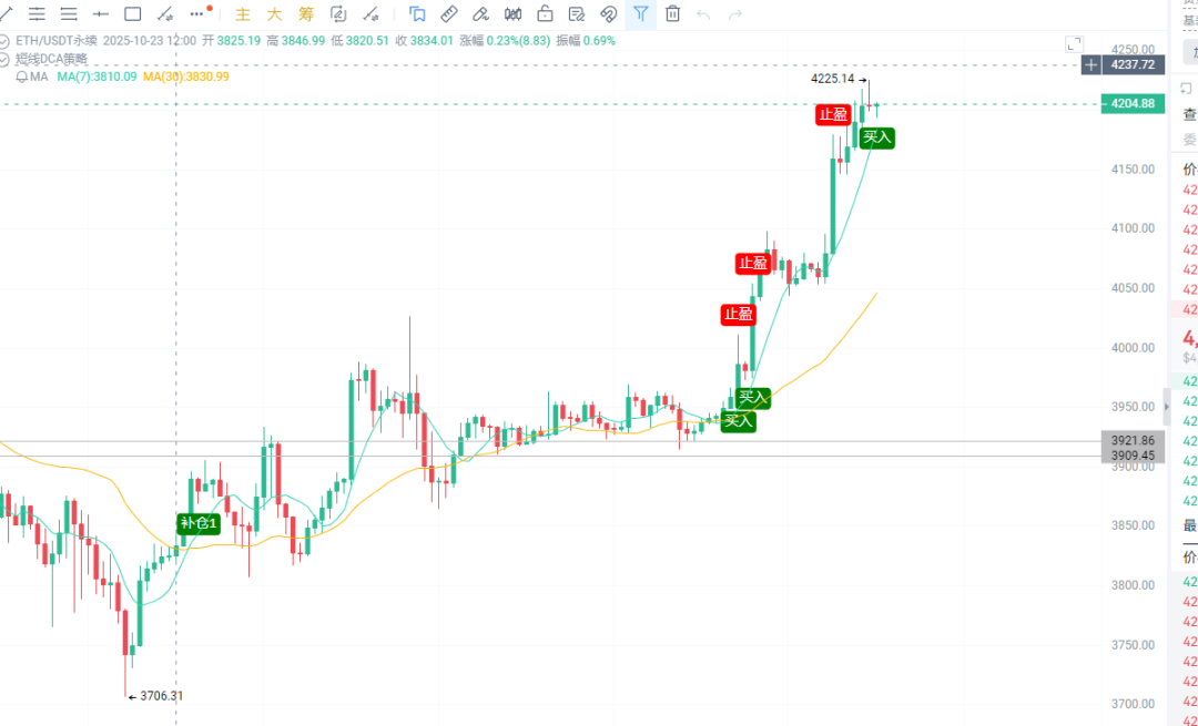 1. Overall analysis The ETH market is currently in an upward trend, and the technical aspect shows increased momentum. The long moving average arrangement and the golden cross signal form a strong bullish resonance, and the K-line pattern shows a bullish engulfing signal, further confirming the market's upward trend. However, it is important to note that there is a risk of a pullback in the short term, mainly due to the overbought condition of the RSI indicator and the strong sell signal from the custom DCA strategy indicator, which indicates that the price may be close to the short-term high. The key support level of 3909.45 needs to be focused on. If the price falls below this level, it may intensify the correction pressure.