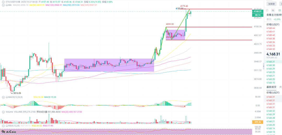 Market status comparison- ETH: Oscillatory range (key resistance 4180), high volatility + overbought status, facing correction pressure in the short term