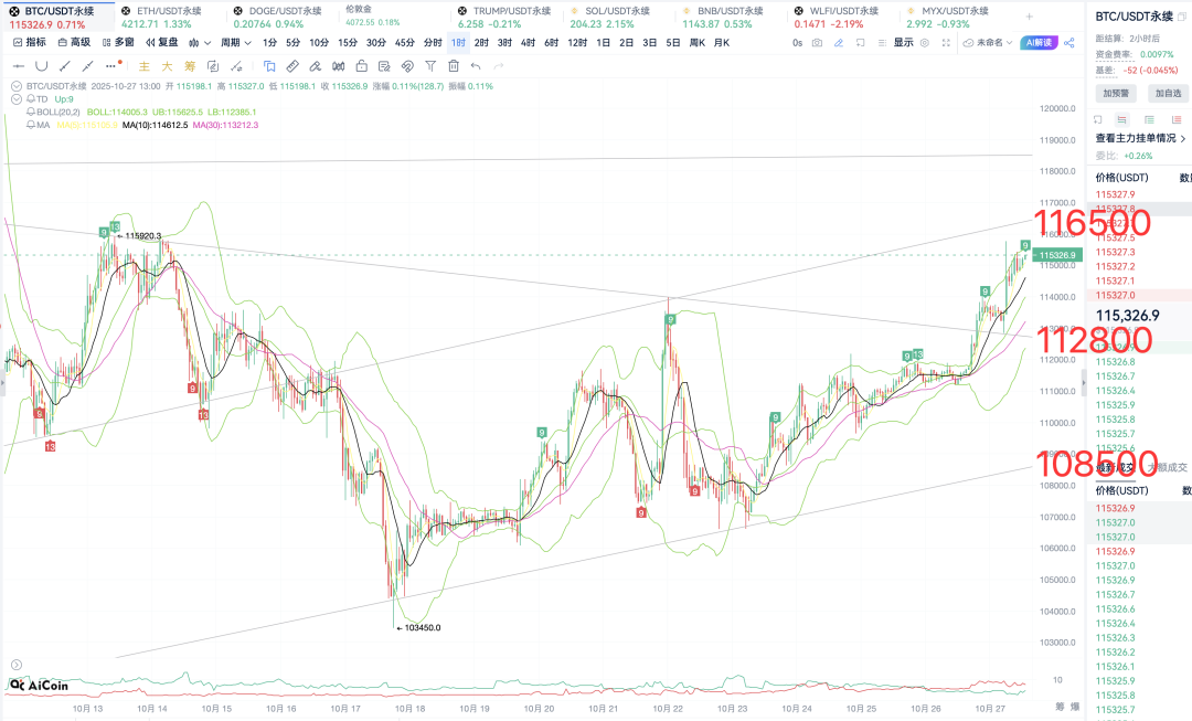 BTC market analysis today, yesterday evening BTC broke through the level of suppression near 113000 analyzed in the previous analysis, reaching a maximum of 114000, breaking the market, and suppression became support. After testing 113000 this morning, the highest rose to 115800. The trend chart is as shown in the figure. During the day operation, continue to pay attention to the trend support level near 112800. It is recommended to go long if the range of 112800-113000 is not broken. If the level is broken, look for more near 111300. ; At the top, focus on the trend suppression level near 116500. It is recommended to go short if the rebound range of 116800-116500 is not broken. If the level is broken, it is recommended to go short near 118500. Technically, the daily Bollinger Bands have shrunk. Currently, they have collected 4 positive bars in a row and are running in the middle and upper rail range. The trend continues to be bullish. Pay attention to the support formed by the intersection of the middle rail and MA5 near 112000. After the sharp rise, you can first look at a wave of callbacks to repair the market space during the day. In the past 12 hours, 4 positive bars have been collected continuously, running along the Bollinger Band track, and a green 9 appears above the TD indicator, indicating that the general direction has turned bearish. In terms of operation, it is recommended to rebound to highs and then go short. From a short-term technical perspective, the 4-hour K-line shows that the price has fluctuated, but the last K-line is a positive line, the closing price is greater than the opening price, and the trading volume has increased. The price and trading volume have increased at the same time, indicating active trading and strong upward momentum. The MACD indicator shows a bull market, the histogram changes from negative to positive, and bulls are exerting force. However, the KDJ value is 94, which is overbought, and we need to be alert to the risk of a correction. To sum up, BTC has a continued upward trend in the short term, but at present, be wary of chasing bulls at high levels, and it is recommended to trade mainly at high levels for general trend trading. BTC operation strategy today: 1. Shorting in the range of 116800-116500, target 115000-113500, stop loss 117300 2. Go long in the range of 112800-113000, target 114500-116000, stop loss 112300 Risk warning: The market is changing rapidly, and transactions need to be flexibly controlled. Investment is risky, please operate with caution! ![]() |