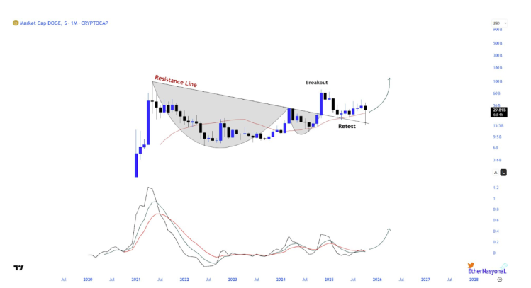 The long-term technical structure of Dogecoin is improving again, and analysts are optimistic about the market outlook. Cryptocurrency analyst EtherNasyonaL published the latest technical analysis on the X platform, pointing out that the structure of Dogecoin (DOGE) on a higher time frame is returning to a positive trend. According to its analysis, the market value of Dogecoin has completed bottoming, its momentum is gradually increasing, and a retest breakthrough of the "cup-handle pattern" is about to appear on the monthly market value chart. ![]() The cup-and-handle pattern breakthrough is confirmed, and retest to verify the effectiveness of the support A chart posted by EtherNasyonaL shows a cup-and-handle structure spanning several years forming on the Dogecoin market cap chart. Among them, the "cup body" part covers 2022 to 2023, corresponding to the long recovery period that Dogecoin has experienced after the bull market peaked in 2021. ; “The “Cup with Handle” represents a convergence below a downward resistance trend line that has repeatedly suppressed rebound attempts during the 2022-2023 bear market. This key resistance was finally effectively broken through in late 2024, along with a clear upward trend, marking the first official shift in the long-term downward trend. Even more noteworthy is the fact that the breakout resulted in a successful retest of the original resistance line, now converted into support. In mid-October, Dogecoin briefly dipped to $0.15 before quickly rebounding, confirming the validity of the new support. ![]() In technical analysis, such retests completed on high time frames are usually more credible and often indicate a significant directional market may follow. Based on this judgment, EtherNasyonaL concluded that Dogecoin has completed its momentum-building stage, laying the foundation for a further rise in market value. ![]() Continuing higher lows and the MA25 moving average create a bullish pattern Another key aspect of this analysis is the "higher low" sequence formed by Dogecoin's market capitalization since mid-2023, which shows that the lows of each correction are higher than the previous one, showing a positive structure of a gradually rising bottom. At the same time, the 25-month moving average (MA25) in the chart continues to play a dynamic support role, effectively supporting the price trend. Currently, the market value of Dogecoin is running steadily above this moving average. As long as this support pattern is not destroyed, the overall bullish structure will remain intact. If, as shown in the EtherNasyonaL chart, as the MACD indicator continues to improve and momentum further increases, Dogecoin may usher in a new round of expansion, and its market value is expected to hit the US$100 billion mark. As of press time, Dogecoin is quoted at US$0.20, with a market value of US$29.82 billion. #Currency Circle#BTC#ETH#Cryptocurrency#Dogecoin#Altcoin 📌Click to follow and continue in the next issue ![]() There are many opportunities in the currency circle now, so you need to seize them in time! In the near future, the community will recommend several skyrocketing coins, and I will take everyone to aim at the opportunities to get rich in copycats. There is no problem with the expected space being more than 10 times. Welcome to private message me to join our VX→→mmxy1368; QQ:→→3788353562 ![]() |