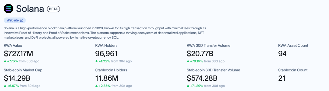 In the past 30 days, the amount of RWA transfers on the Solana chain has reached$20 billion, the transaction volume is second only to Ethereum, showing strong growth momentum.