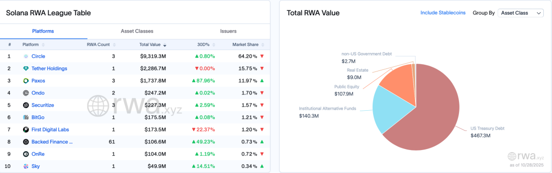 - Tokenization of Treasury Debt : Ondo Finance’s USDY total value reaches US$170 million , becoming the largest non-stable currency RWA asset on Solana; Products such as BUIDL, a collaboration between BlackRock and Securitize, and VanEck’s VBILL have also been launched on Solana. As of October 28, 2025, the total value of U.S. Treasury securities tokenized on the Solana chain reached $467 million.