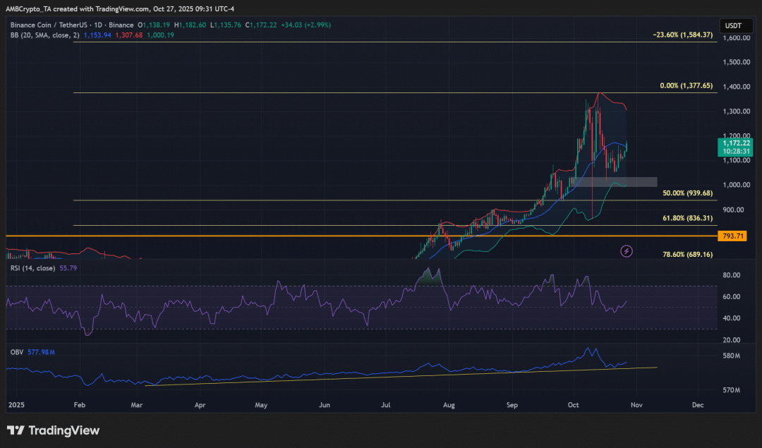 In circulation, a total of 64.26 million BNB tokens have been destroyed so far BNB Chain destroyed 1.44 million BNB tokens worth over $1.65 billion in the latest round of deflationary action. The destruction plan started in 2017 and is conducted every quarter. So far, 64.26 million BNB have been destroyed. Currently, there are only 137.7 million BNB tokens in circulation. At a deflation rate of approximately 4 million BNB per year, the altcoin's supply may shrink to less than 100 million within ten years. ![]() Deflation and BNB on-chain activities As partnerships continue to expand, including bringing countries like Kyrgyzstan on-chain, more activity will result in higher fees. Therefore, the speed of burning money will also increase. Perhaps, the supply crunch may accelerate in the coming years. Overall, Binance founder Changpeng Zhao attributed the altcoin’s appeal to “building and community efforts,” including demand from funding companies. Here, one can also compare BNB to Hyperliquid [HYPE], which also has an aggressive deflation plan. HYPE, on the other hand, has maintained its moat with its excellent products and buyback program. Can it keep BNB above $1,000? So far, BNB has held above the psychological $1,000 mark after finding resistance near $1,400. If there is a break above the previous high, $1.5,000 could become the next bullish target. ![]() It is worth mentioning that despite the recent weakening, the daily RSI remains above average. Likewise, On-Balance Volume (OBV) did not fall below its key trendline support in 2025. Taken together, all technical indicators are biased towards the bullish side. On-chain data also supports the above bullish bias. According to data from Arkham, overall on-chain transaction traffic was negative in October. Even the flash crash did not trigger massive selling by BNB holders. As of this writing, the average exchange outflow is 179,000 BNB. This means more BNB has been moved from the platform to self-custody accounts – a positive sign. ![]() Deflation plans, around 4 million BNB per year, growing network activity, and on-chain data all seem to be leaning towards the bullish side so far. This may justify investing or holding the coin for the long term. However, for traders, short-term factors such as the macro environment and any negative news may still affect price movements. This article is only market analysis and does not constitute any investment advice. The digital currency market is extremely risky, so please make decisions with caution. When we enter the currency circle, we must seize the trend. We are not here to earn wages, but to make a fortune. Now the trend is in front of us. If you don’t seize it, if you miss this wave, you may have to wait another 2 years! In the current market environment, short-term operations are indeed necessary. If you keep waiting for spot prices to rebound, you may feel the pain of time. I have also recently been working hard on the second-level short-term and first-level local dog operations, and the results have been good. Friends who want to keep up can add me on WeChat! Welcome to private message me to join our VX: NWP0721![]() Alternate VX;knswdaqldtwl11 ![]() |